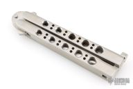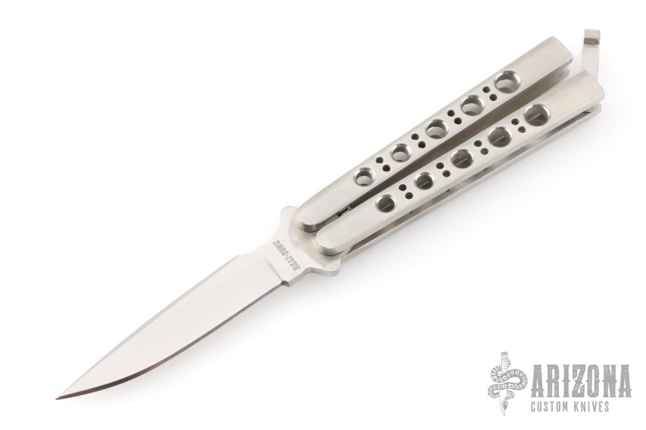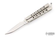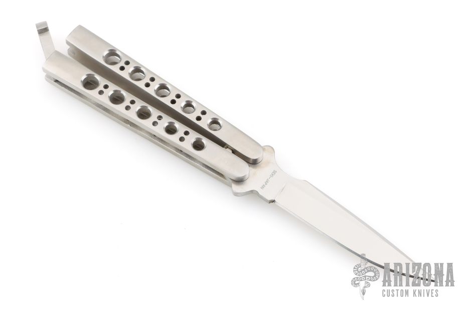This Vintage Balisong by G Sakai features a satin finished blade. The handle has satin finished stainless steel handles with a T-latch. Excellent condition. Comes with original box.