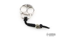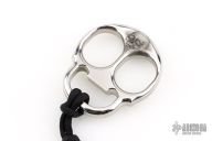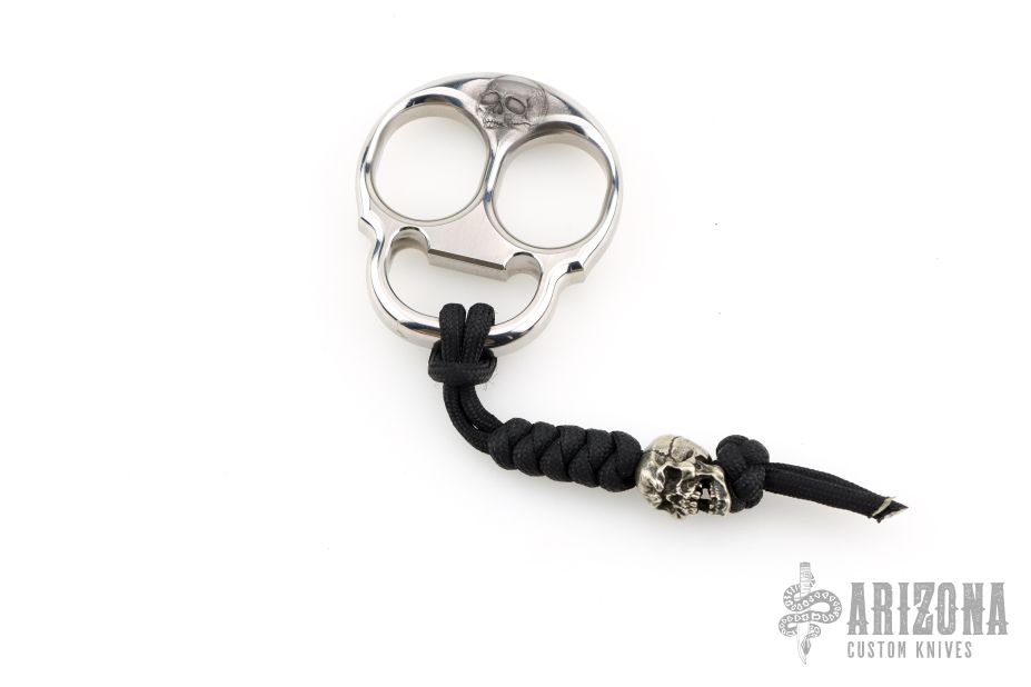 Happy Go Knucky double finger knuck by Kevin King Leather. Titanium construction with satin finish and .374" thickness. Skull engraved with lanyard and bead. Excellent condition.