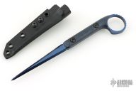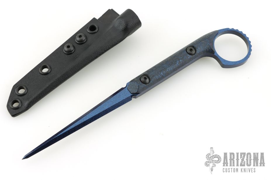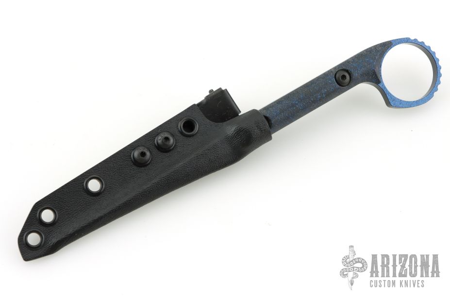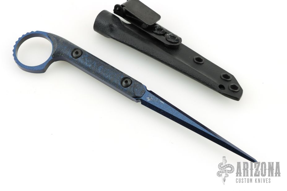 This Ringed Cardiac Spike by Half Face blades. Has a blue tone cerakoted blade with blue splatter scales. Comes with kydex sheath with belt clip. Excellent Condition.