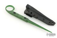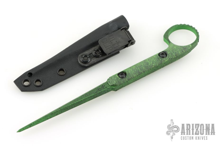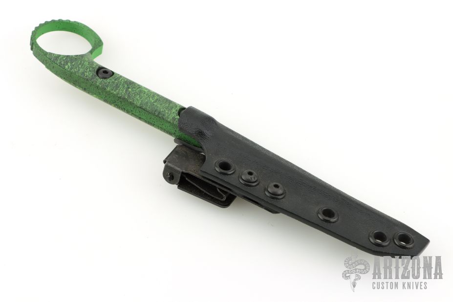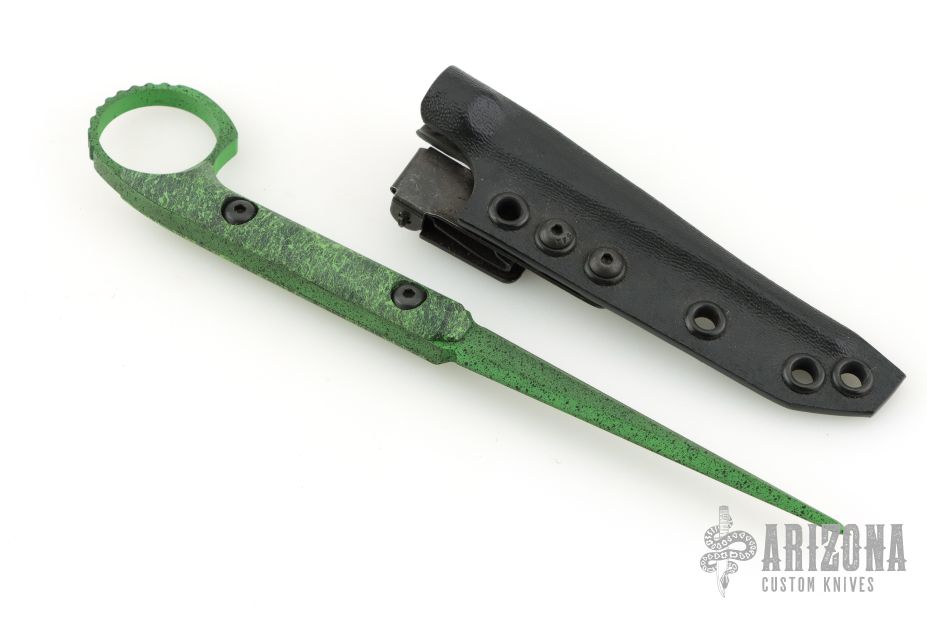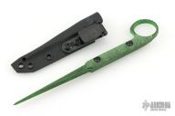 This Ringed Cardiac Spike by Half Face blades. Has a green tone cerakoted blade with green splatter scales. Comes with kydex sheath with belt clip. Excellent Condition.