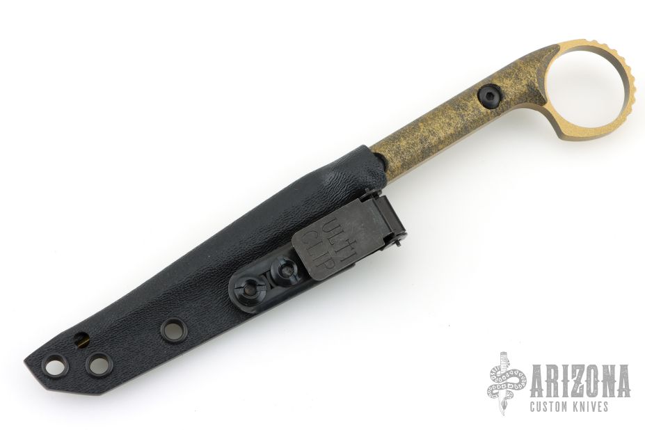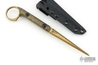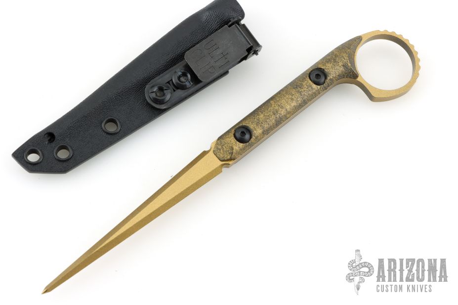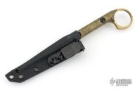 This Ringed Cardiac Spike by Half Face blades. Has a gold tone cerakoted blade with gold splatter scales. Comes with kydex sheath with belt clip. Excellent Condition.