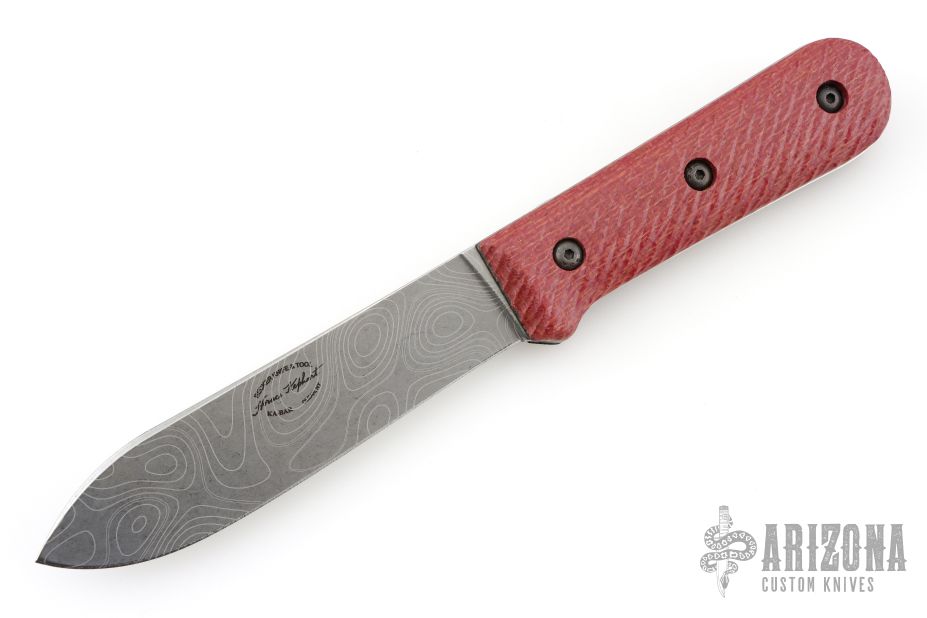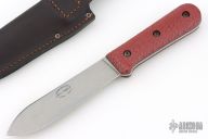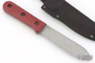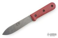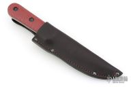 This knife has a laser engraved blade, black liners, and textured red burlap micarta covers. Listing includes original box, papers, and leather sheath, as well as the original wood covers. Excellent condition.