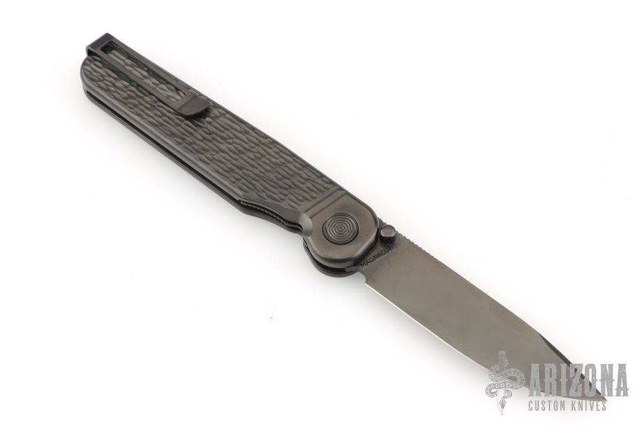 The Rockwall by Tactile Knife features a DLC Magnacut blade with notched thumbrest and dual thumbstuds. The handle has a jigged titanium frame with a tip-up stainless steel clip and backspacer. Comes with original box and COA. Has a couple light scuffs. Excellent condition.