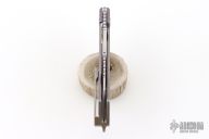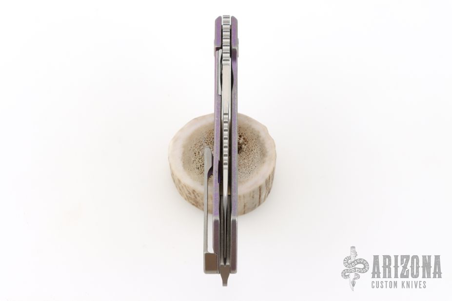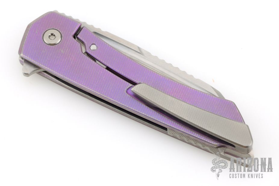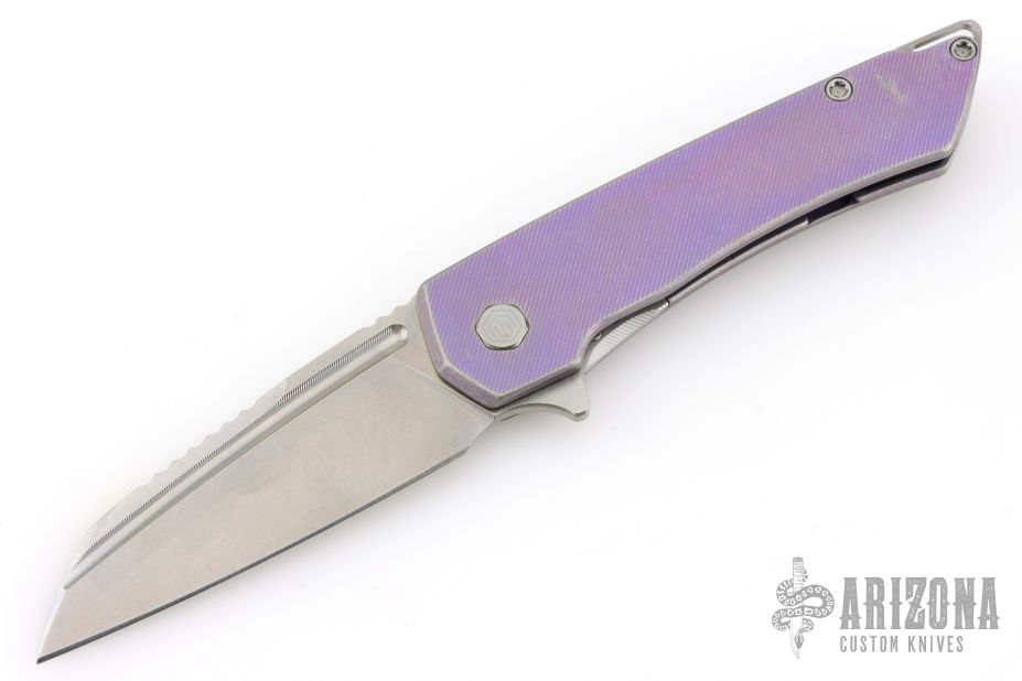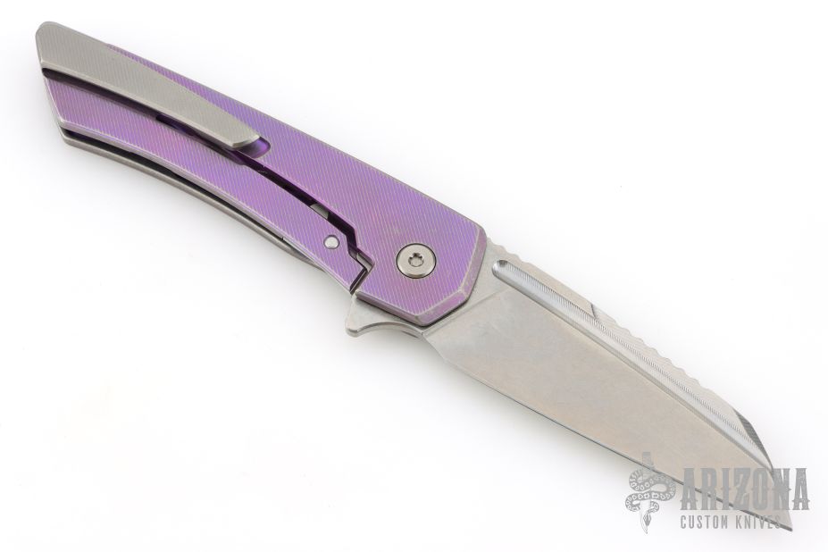 This Mojave by Machine Wise features a stonewashed blade with flipper tab, notched thumbrest, and fuller. The handle is anodized titanium with a milled pattern. Titanium tip up clip. Includes original 3D printed box, tool, lube and card. S/N 245. Has some light scuffs, otherwise excellent condition.