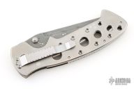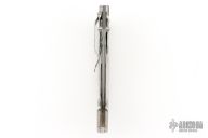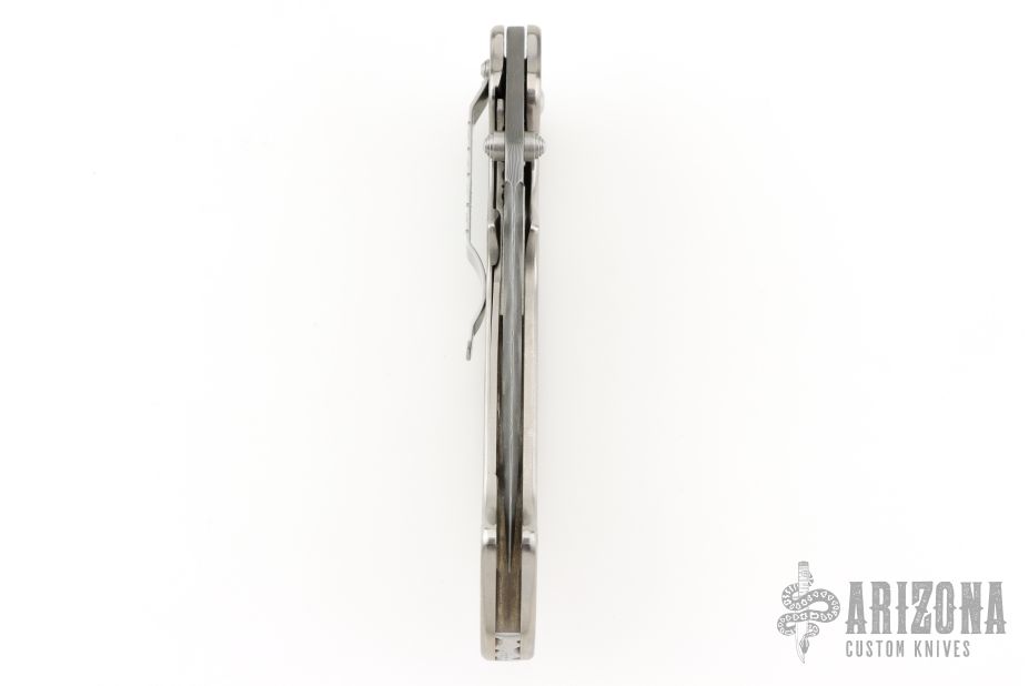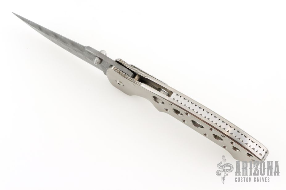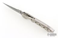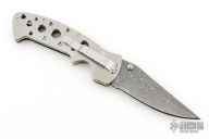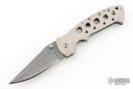 This Kasper Framelock from Crawford features a Damascus blade with false top edge and dual thumbstuds with. The handle has a satin finished titanium frame with file-worked thumb ramp, fileworked stainless steel backspacer, tip down and fileworked steel clip. Nice detent, lockup and blade seating. Comes with maker's nylon belt sheath. Very nice work on this one! Excellent condition.