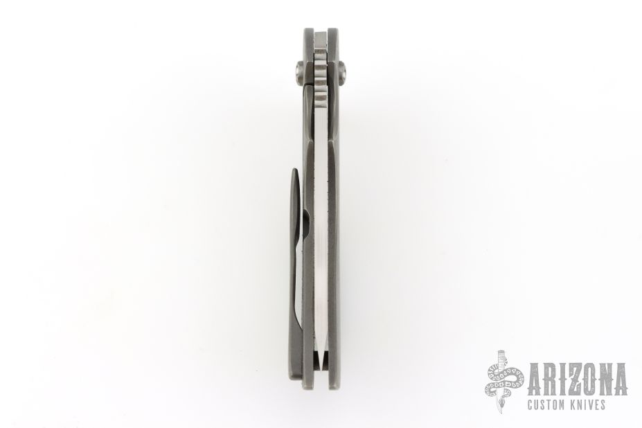 This Barely Legal framelock flipper by Jeff VanderMeulen features a hand rub satin finished blade with notched thumbrest and flipper. The handle has a tumble finished titanium frame and pocket clip, tip up carry. Rides on bearings, nice detent, lockup and blade seating. #81 inside frame and dated 2-2016. Comes with a zippered case. Excellent condition.