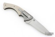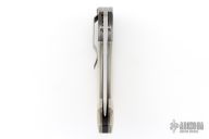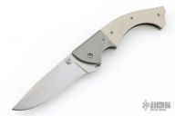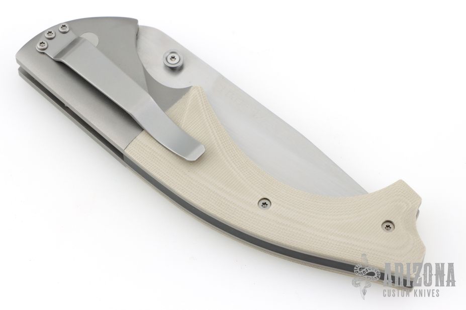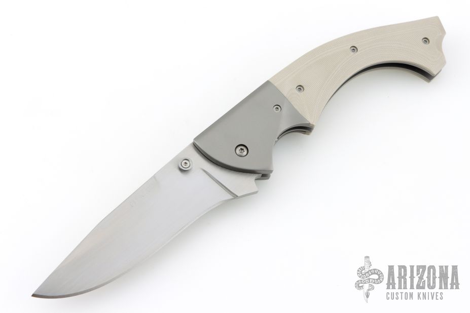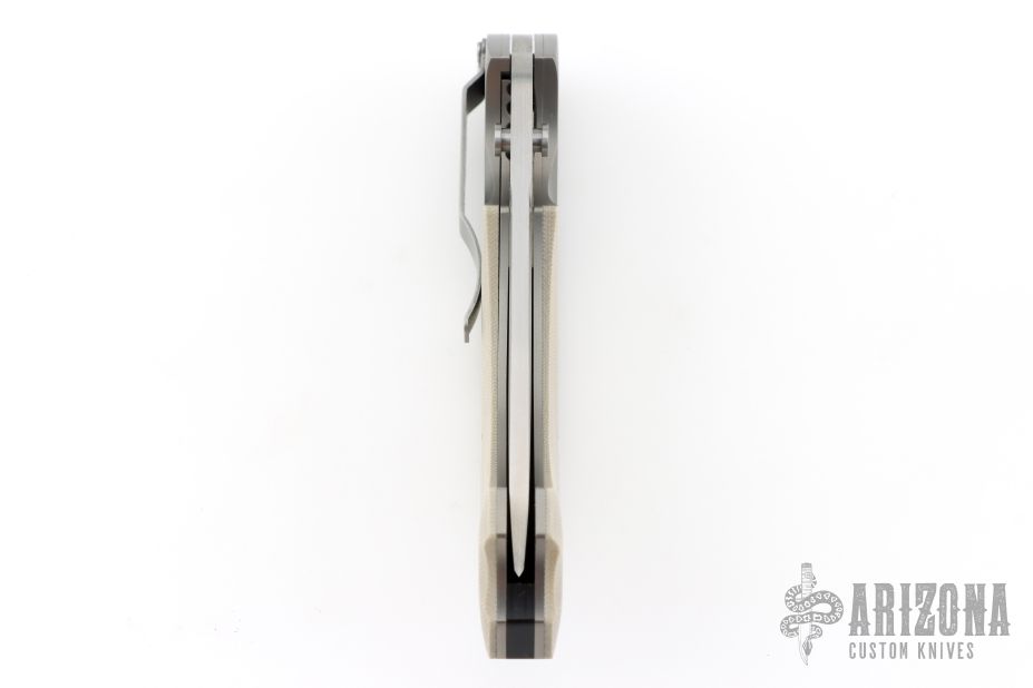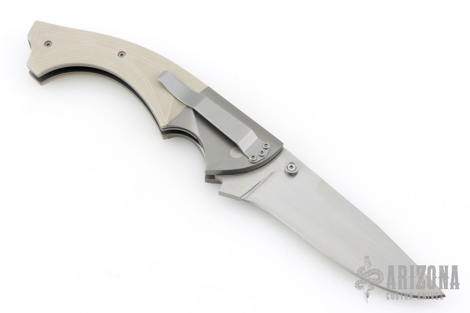 This knife by Mike Obenauf and Joel Pirela is #001, it features a satin finished drop point blade with dual thumb studs. The handle has bead blasted titanium bolsters and liners, tan G10 scales, black G10 backspacer and tip down clip. Nice detent, lockup and blade seating. Comes in a zipper case. Excellent condition. Numbered 4 of only 10 ever made.