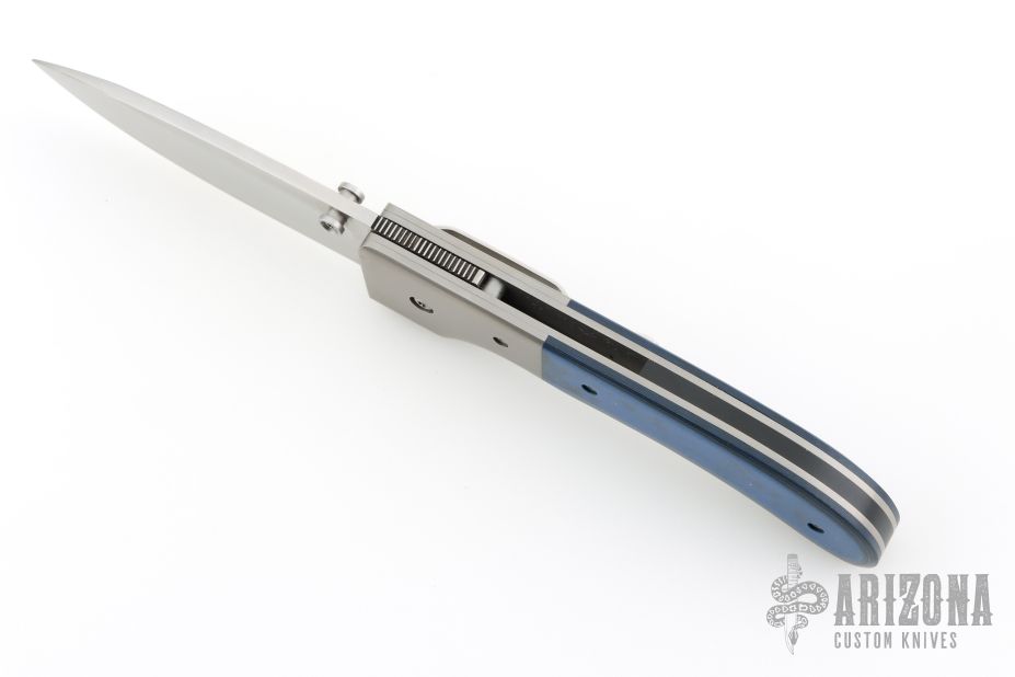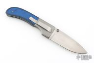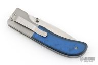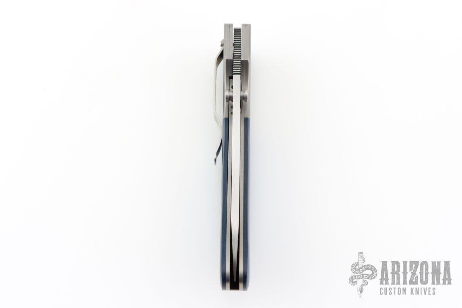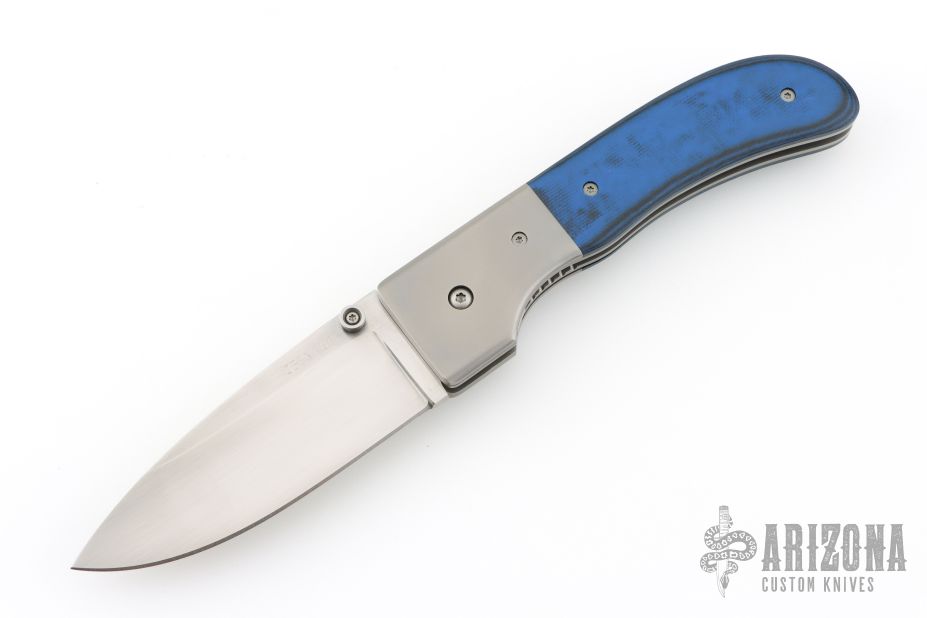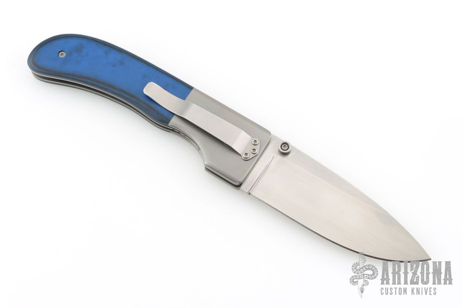 This Large Model 1 by Mike Obenauf features a bead blasted drop point blade with swedge, dual thumb studs and notched thumb rest. The handle is comprised of bead blasted titanium bolsters and black/blue G10 over bead-blasted titanium liners and black backspacer. Bead blasted tip down clip. Solid lock up. Comes with a zipper case. Excellent condition.