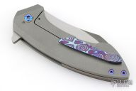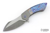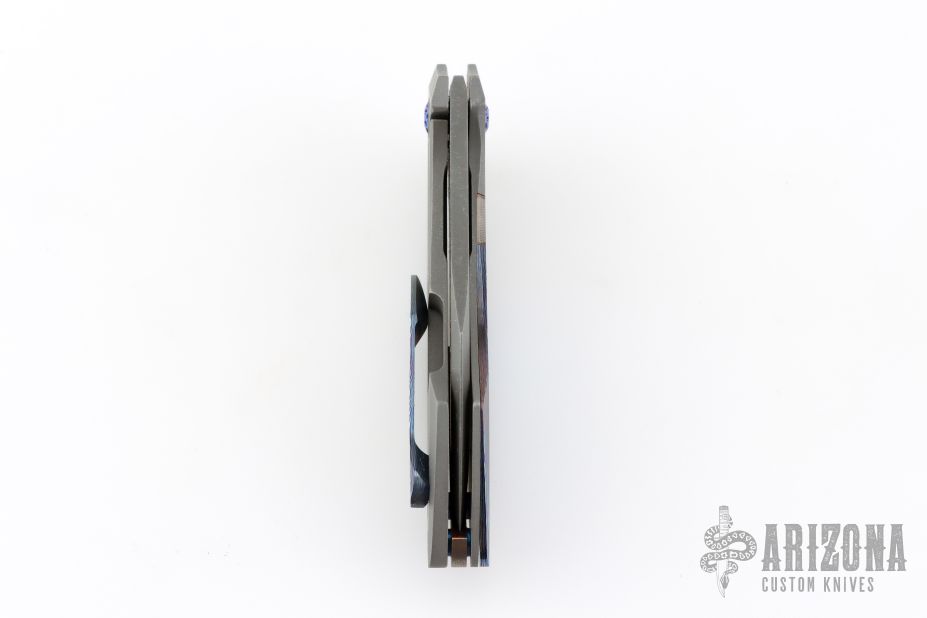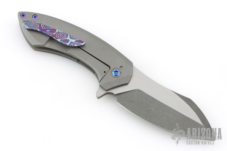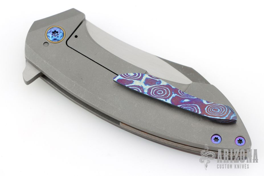 This Argonaut CMF Metalworks features a two tone satin finished blade with flipper and acid-washed bevels. The handle has acid/tumble finished bolsters, integral liner, super conductor floating backspacer/overlay, timascus cover and tip up clip with hidden screws. Rides on bearings, nice detent, lockup and blade seating. Comes with a zippered case. Excellent condition.