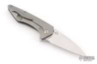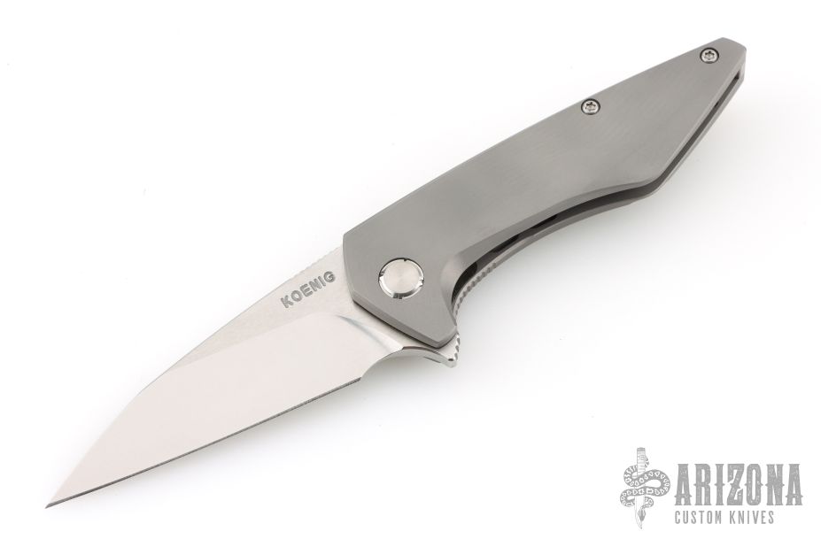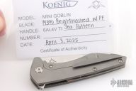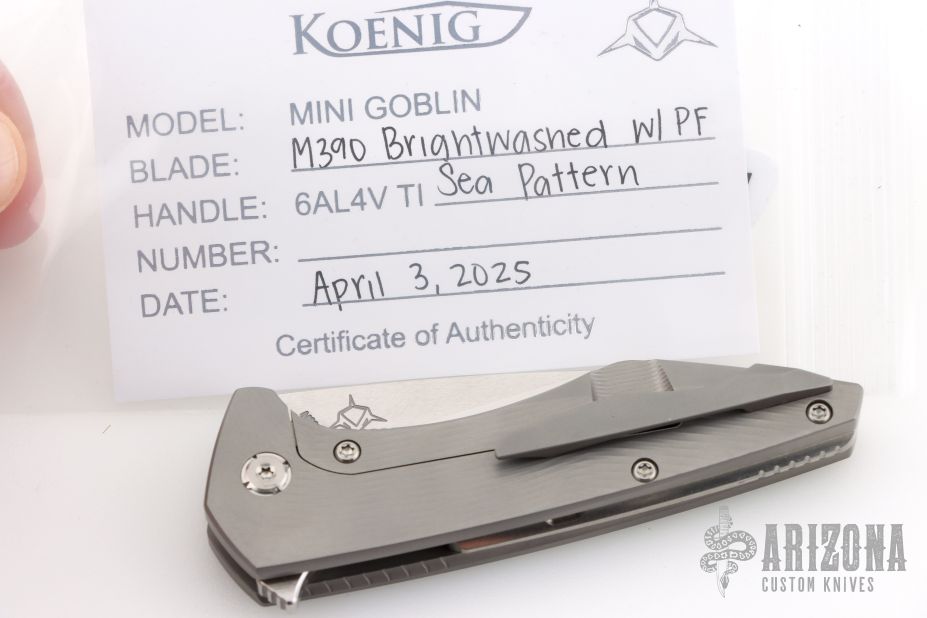 The Koenig Mini-Goblin 3 inch folding pocket knife is a collaboration between Edison Barajas of Sharknivco and Koenig Knives. The Mini-Goblin features a 3 inch brightwashed w/ PF blade with notched thumbrest and flipper. The handle has a bead blasted sea pattern titanium frame with a stonewashed titanium backspacer and satin titanium pivot/hardware. Titanium tip up clip with hidden screws. Comes with original box and card dated April 3, 2025. Excellent condition.