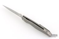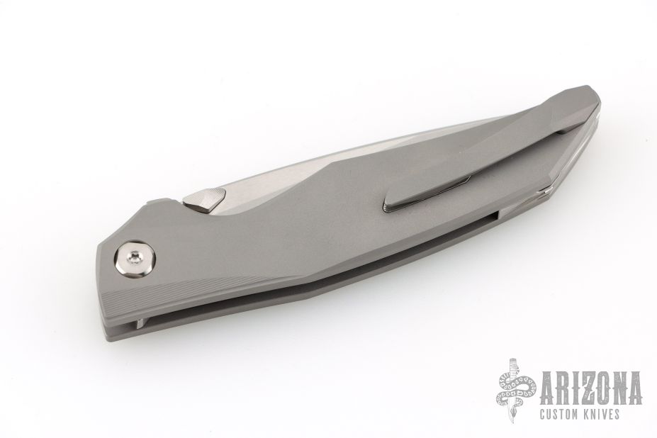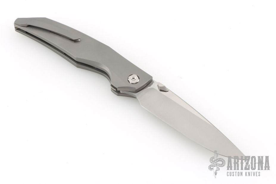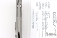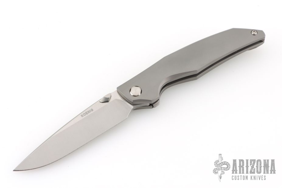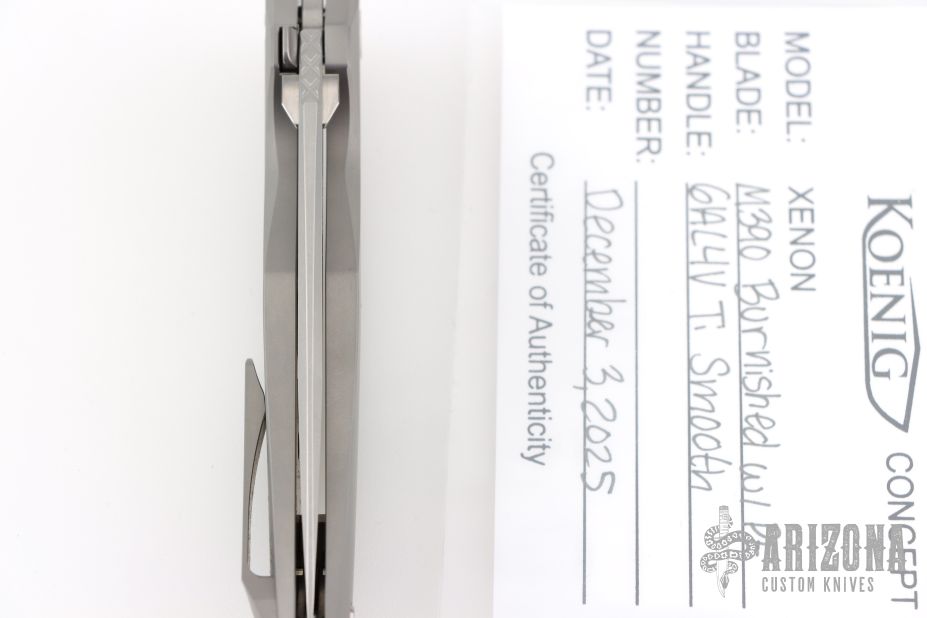 This Xenon by Koenig Knives features a two-tone burnished w/ PF blade with notched thumbrest and flipper. The handle has a smooth titanium frame with a titanium backspacer, pivot, and hardware. Titanium tip up clip with hidden screws. Comes with original box and card dated December 3, 2025. Excellent condition. First Production Run - as per consignor.