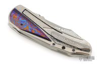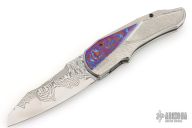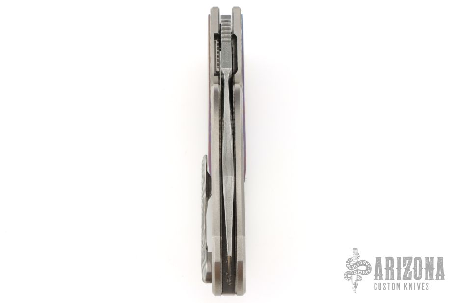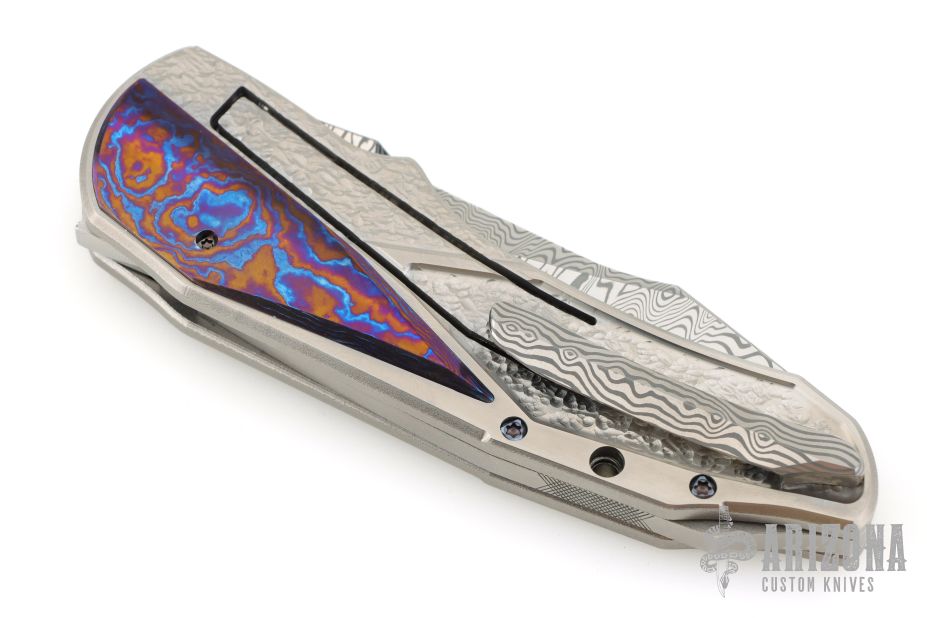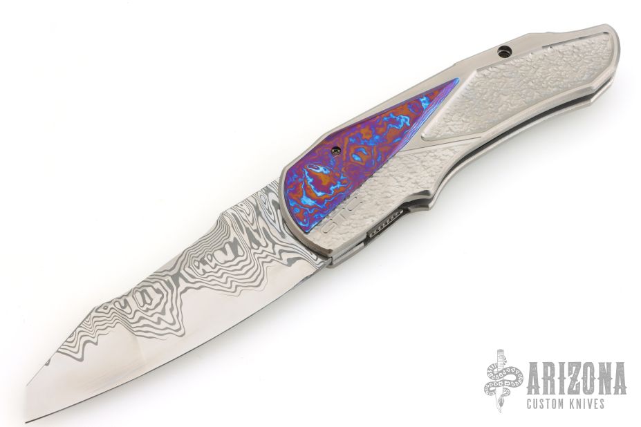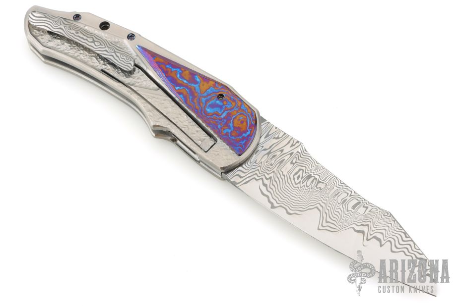 This Macchina by GTC features a polish finished Damascus (CPM154/19CZ7) blade with flipper and swedge. The handle has a satin finished titanium frame with textured panels, orange peel finished edges, Ti-Damascus inlays, hand checkered titanium backstrap, and a matching Damascus tip up titanium clip with hidden screws. Comes with zippered case and COA dated 2025. Excellent condition. Damascus and Ti-Damascus made by Gus.