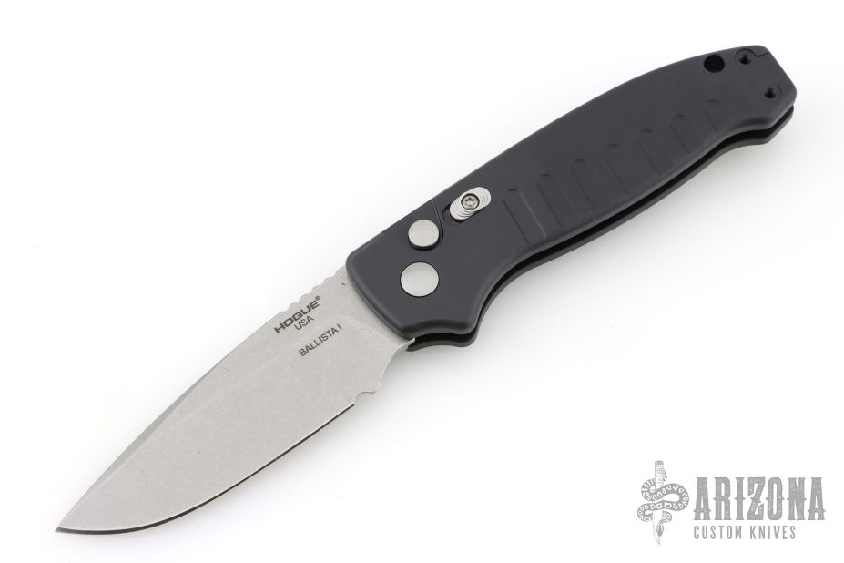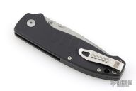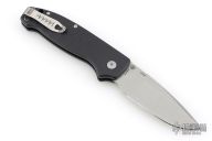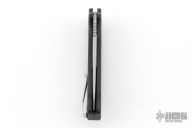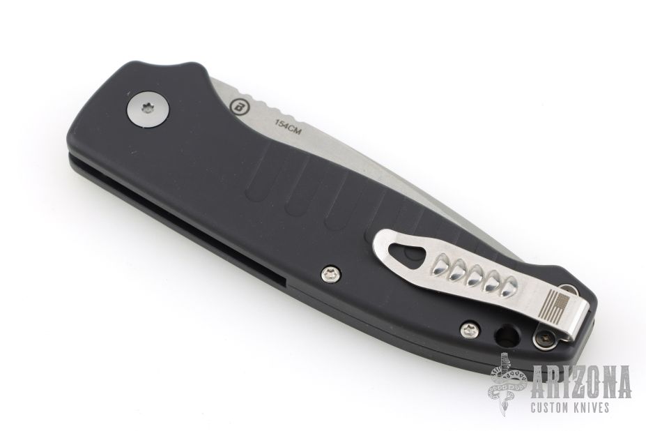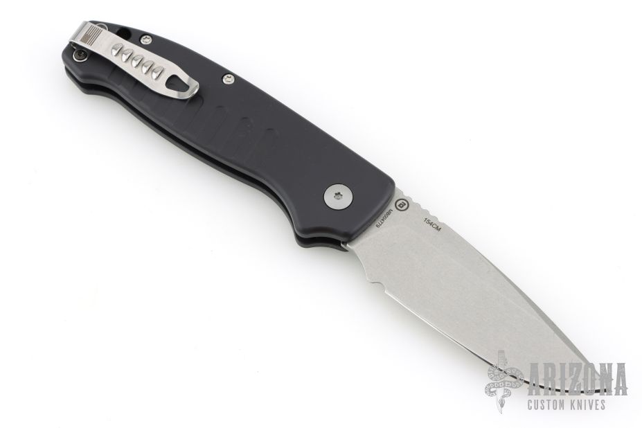 This knife features a stonewashed drop point blade with a notched thumbrest. The handle has a black alumnium frame with a tip up steel pocket clip. Comes with original box, papers, and zipper case. Excellent condition.