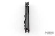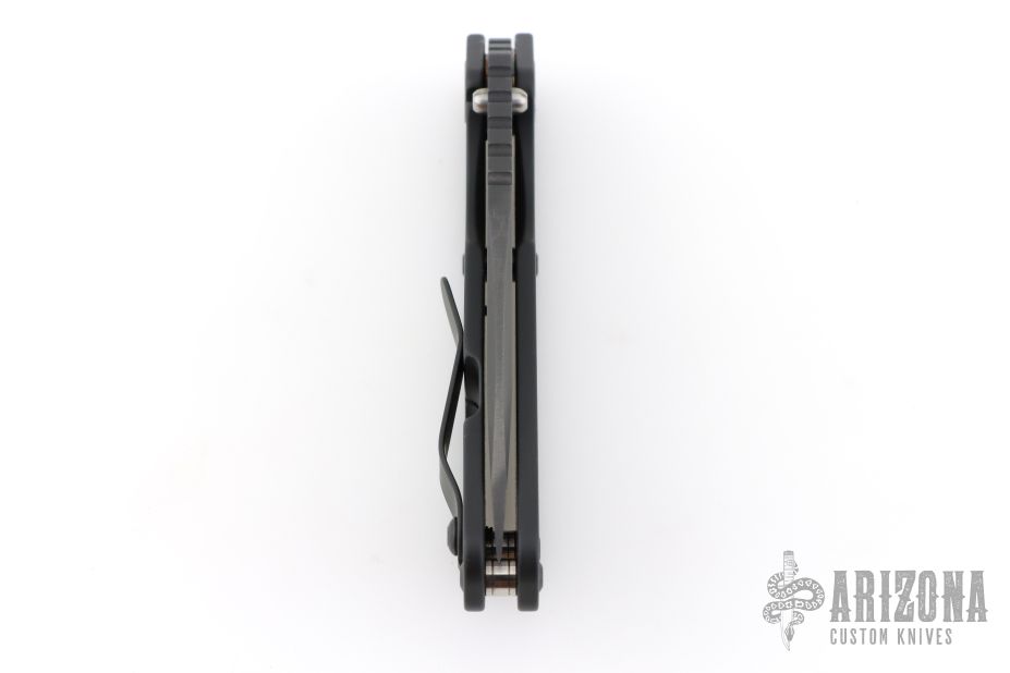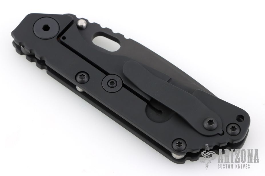 This Mick Strider SNG framelock folder features a black drop point blade with thumbhole and notched thumbrest. The handle has a black titanium frame with titanium clip, tip up carry. Jimping on blade spine. Includes Hinderer "Lock Bar Stabilizer" for maximum reverse lock retention. Nice detent, lockup and blade seating. Comes in original DragonCut pouch. Excellent condition.