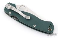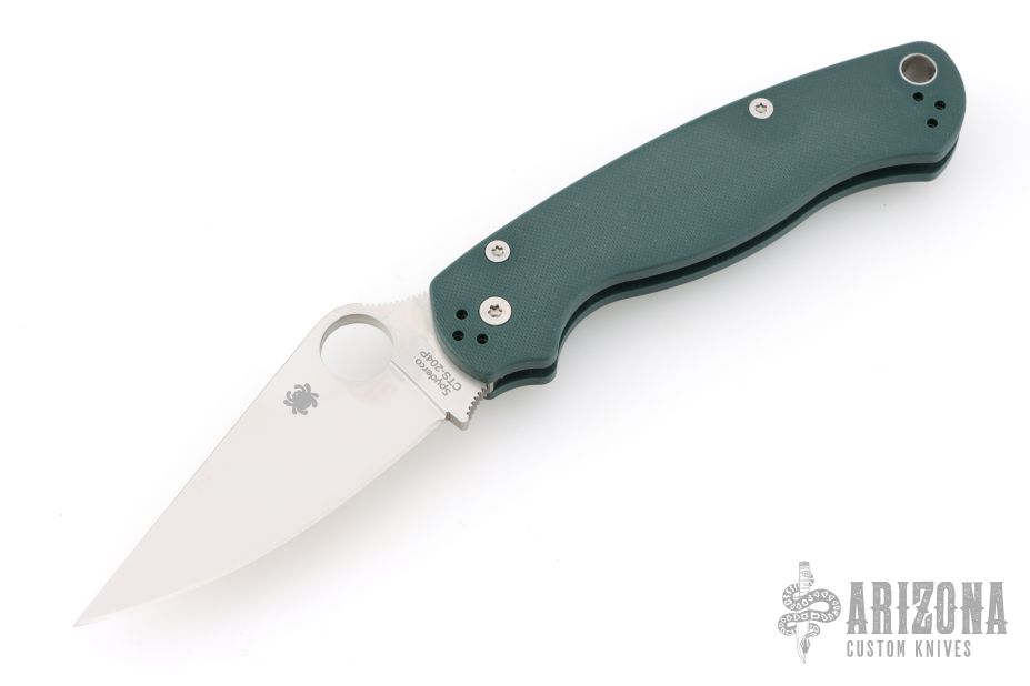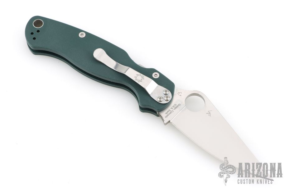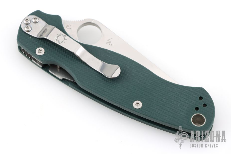 This Paramilitary 2 from Spyderco features a drop point satin finish blade with Spyderco thumb hole and notched thumb ramp and choil. The handle is comprised of green G10 with stainless steel liners and 4 way adjustable pocket clip with lanyard tube on pommel. Comes with original box and papers. Excellent condition.