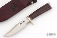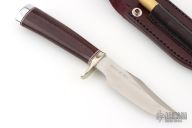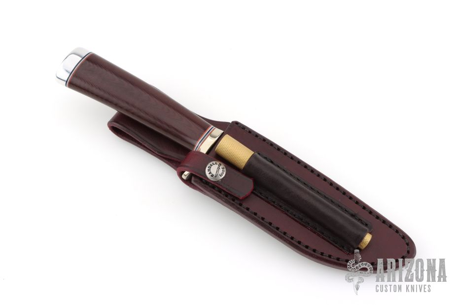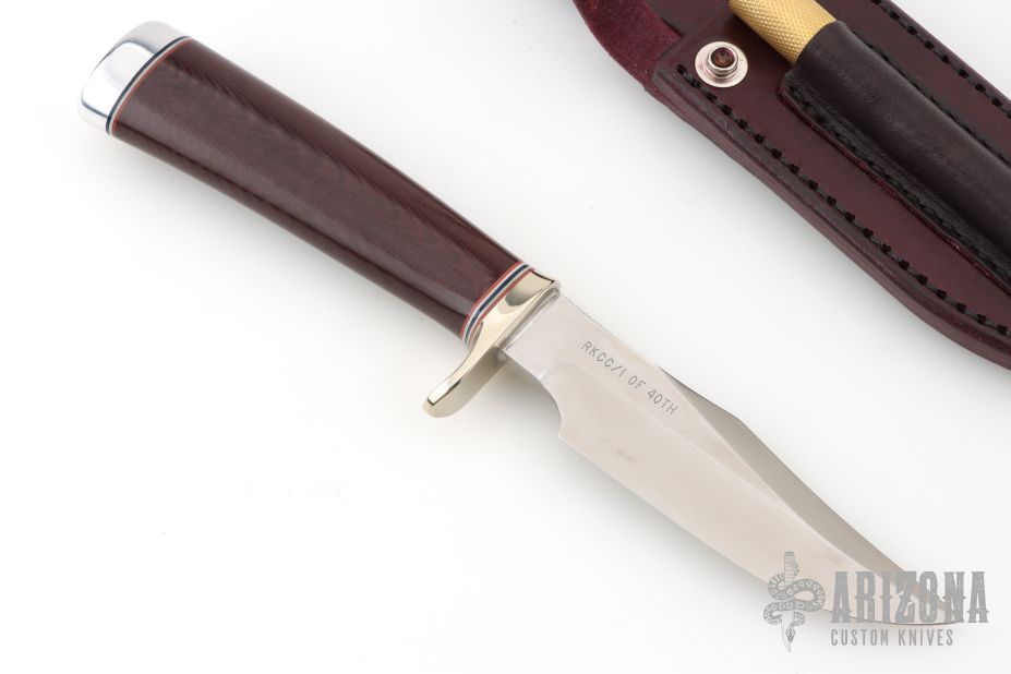 This Stanaback Special features a satin finished blade with sharpened top edge and notched thumbrest, .227" blade thickness and 1.158" blade depth, hidden tang construction. The handle has a nickel silver guard, duralumin butt, burgundy linen micarta grip with red/white/blue spacers. Includes a maroon leather sheath and original paper wrapping. Excellent condition. Has " RKCC/1 of 40th " on the blade.
