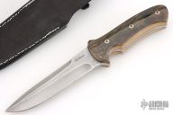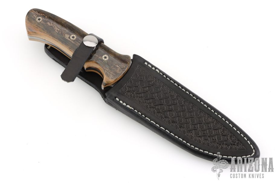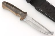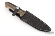 This knife by Kay Brend features a Damascus blade with a sharpened top edge, .195" blade stock and 1.217" blade depth, full tang construction. The handle has mammoth ivory scales with black liners and mosaic pins. Comes with a hand tooled black leather sheath. Excellent condition.