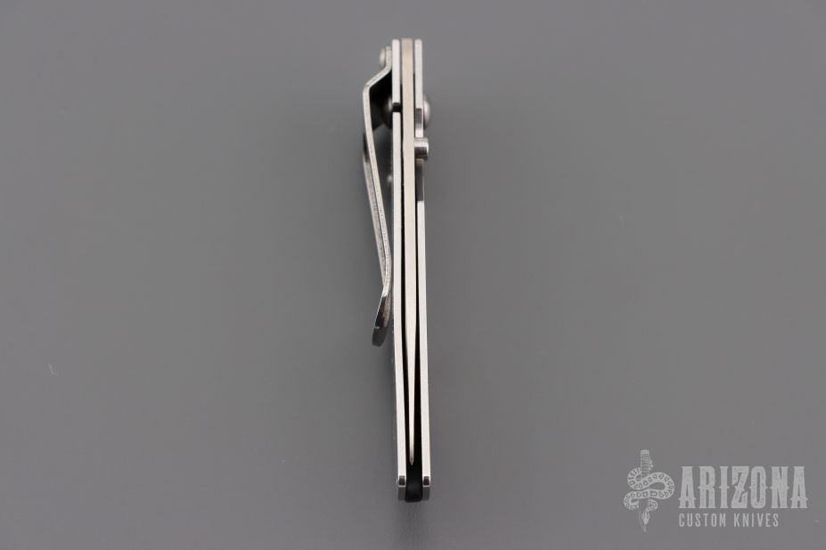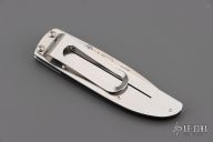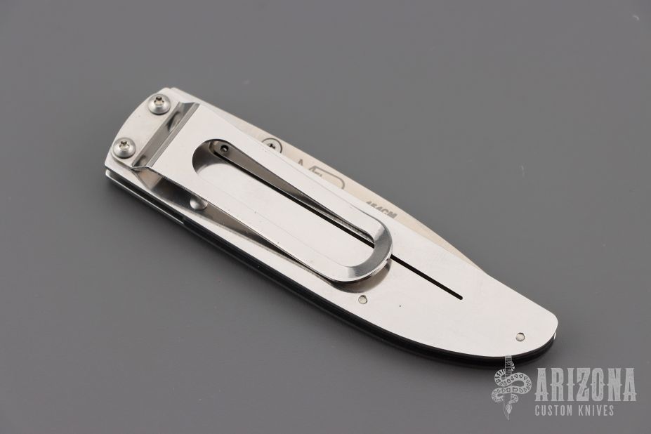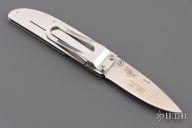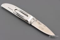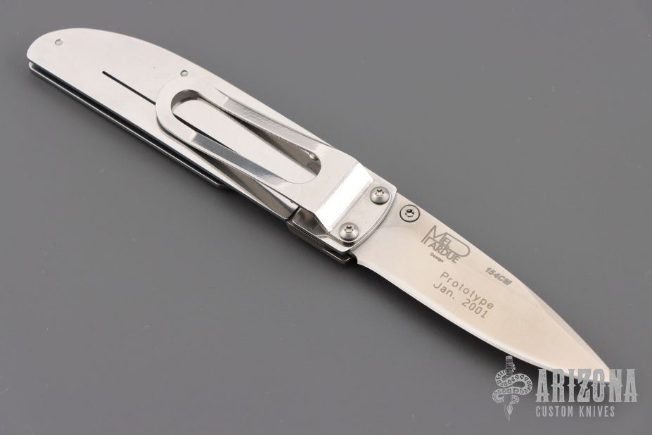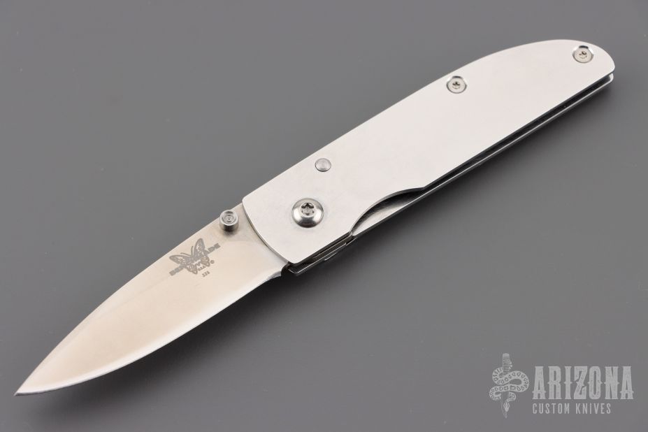 Mel Pardue designed money clip knife by Benchmade. Satin finished drop point blade with single thumbstud. Stonewash/polish finished handle with tip up clip. Includes original box and paperwork. Has a couple light scuffs and scratches, overall excellent condition.