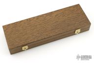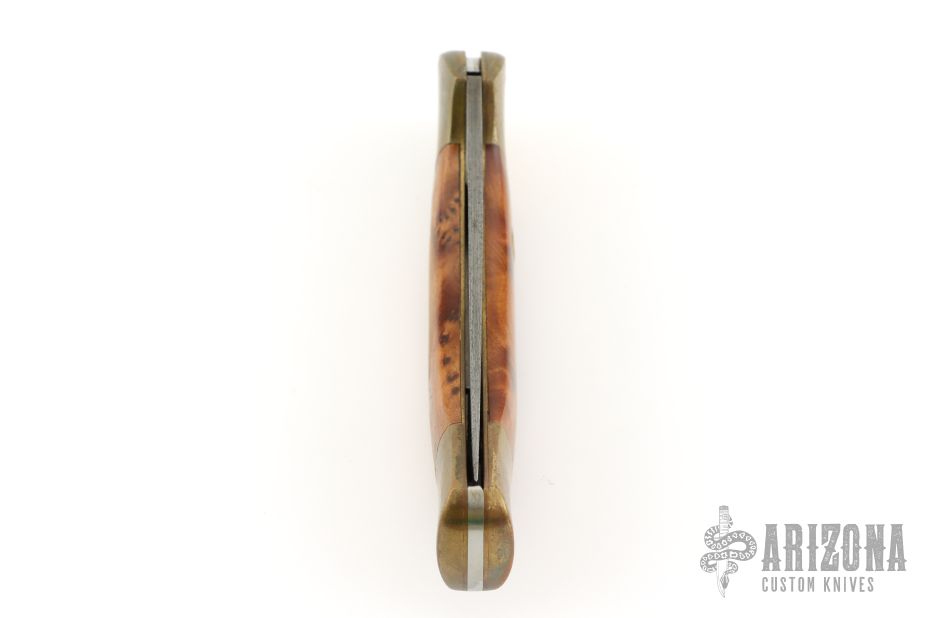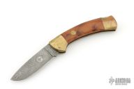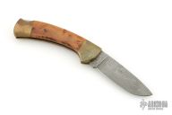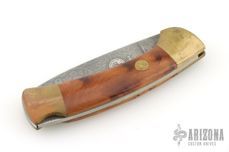 This lockback folder by Boker features a Damascus blade. The handle has brass frame, burl wood inlays, and a stainless steel rockerbar. Comes with original wooden box and papers. Has some scuffs and scratches, good condition overall and for its age.