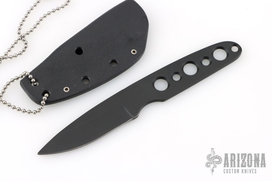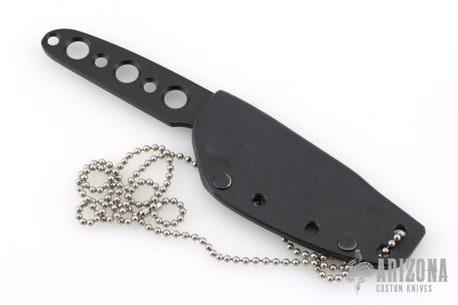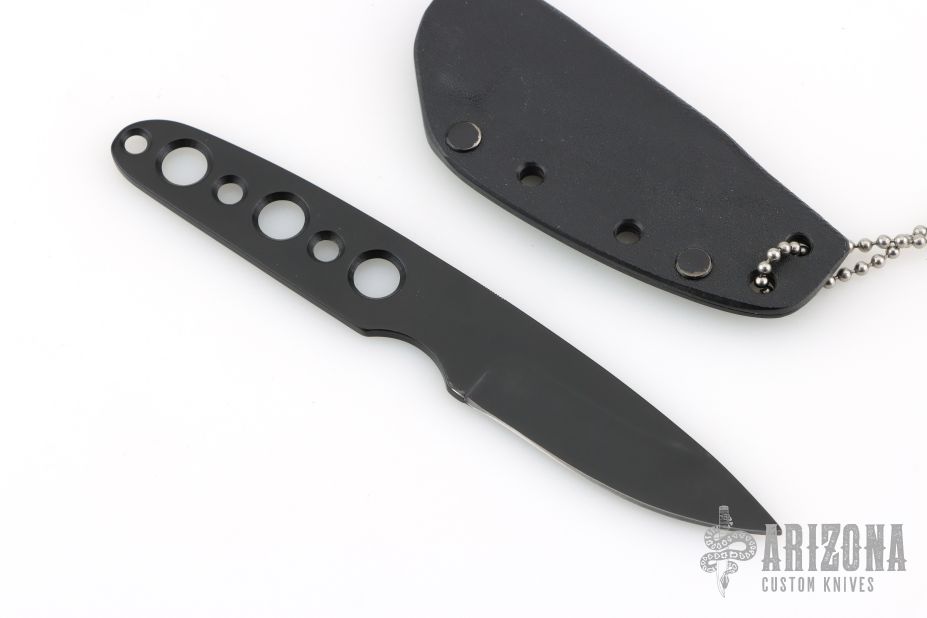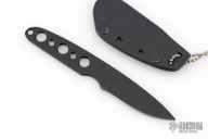 This knife by Rekat features a black finished blade and handle, .123" blade stock and .965" blade depth, integral construction. Comes with a kydex sheath and ball chain. Has a couple light scuffs, otherwise excellent condition.