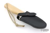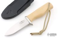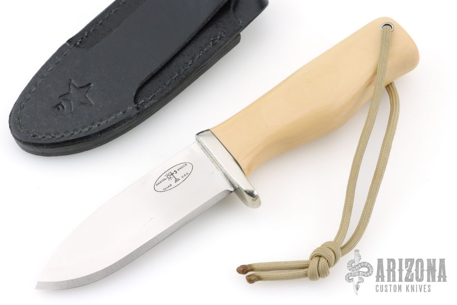 This knife by Martin Knives features a satin finished blade with notched thumbrest, .215" blade stock and 1.281" blade depth, full tang construction. The handle has a nickel silver guard, ivory paper micarta grip with a lanyard hole. Comes with black leather sheath and a zippered case. '06 on back of sheath. Has a couple light scratches, otherwise excellent condition.