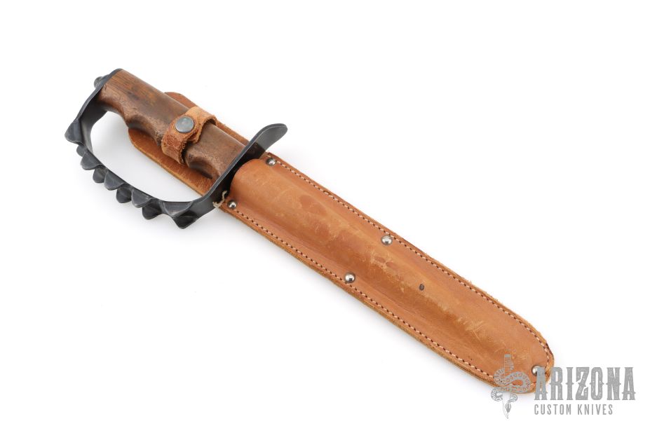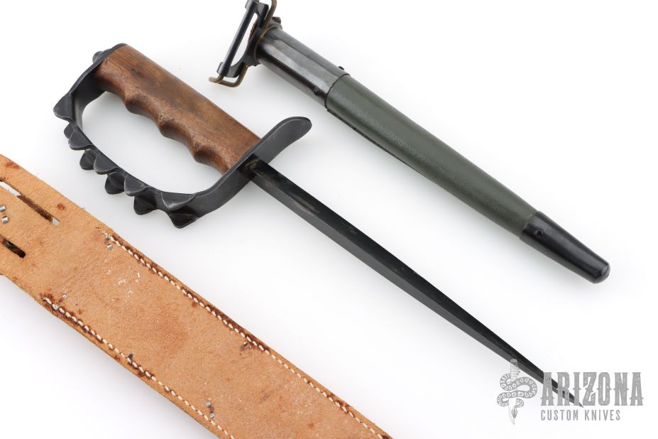 This 1917 Trench Knife by A.C. Co. features a blued triangular blade shape. The handle is comprised of of a steel "D" guard and wood grip over hidden tang construction. Marks from sheath on blade and a couple marks on handle but overall great condition for it's age. Comes with original scabbard, and an additional brown leather sheath.