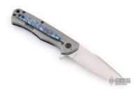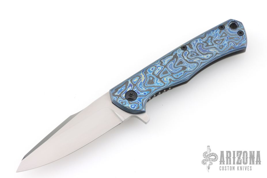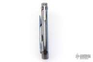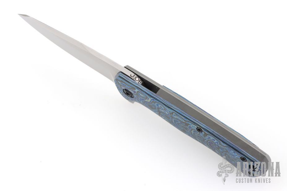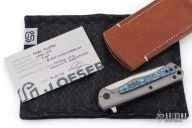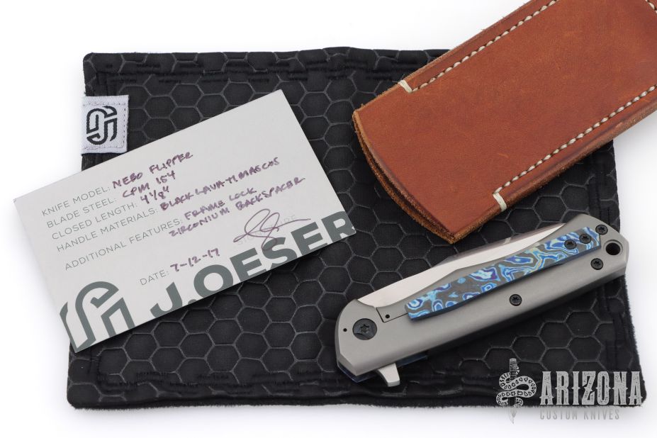 This Nebo flipper by Jared Oeser features a hand rub satin finished blade with false top edge and flipper. The handle has a Black Lava Timascus and blasted titanium frame with a matching tip up clip and a zirconium backspacer. Nice detent, lockup and blade seating. Comes with original box, brown leather pocket sheath and COA. Excellent Condition.