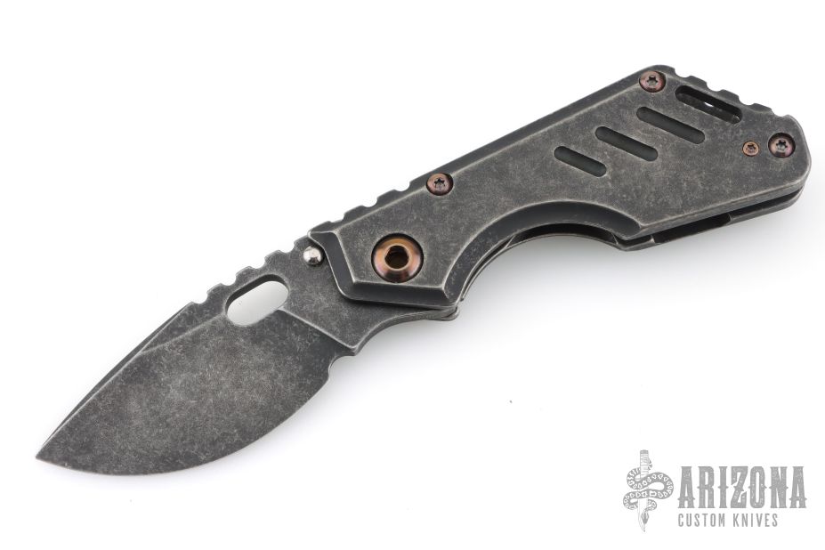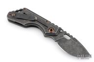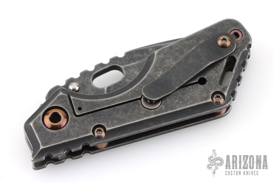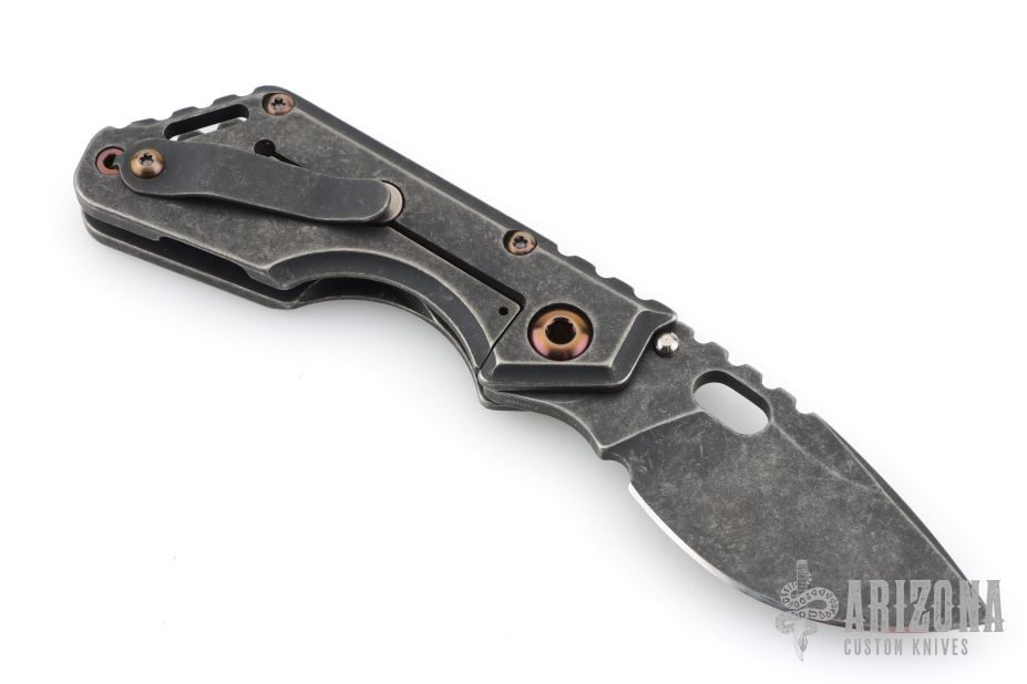 This Mick Strider custom Stub features a distressed blade with notched thumb ramp and swedge. The handle is distressed finished titanium frame with a pocket clip that has a matching finish and is positioned for tip up carry. Blade is centered when closed and locks up with no play. Excellent condition. Comes with a Velcro case.