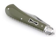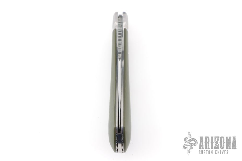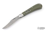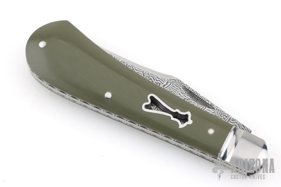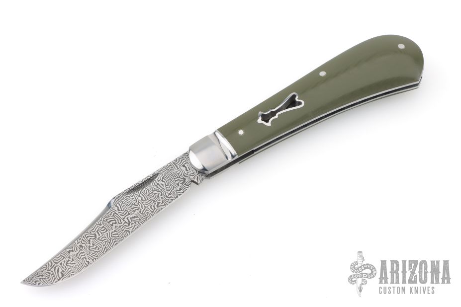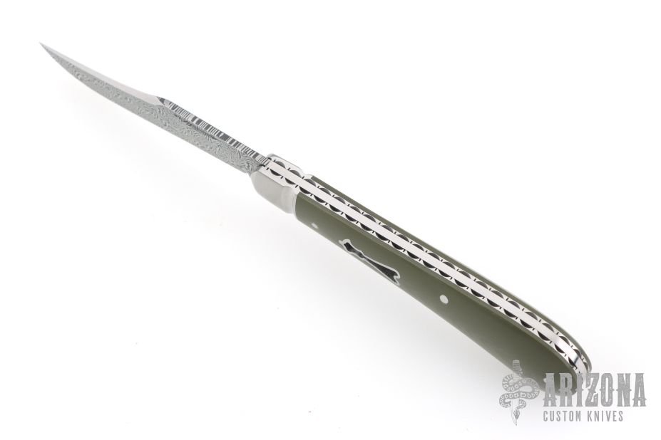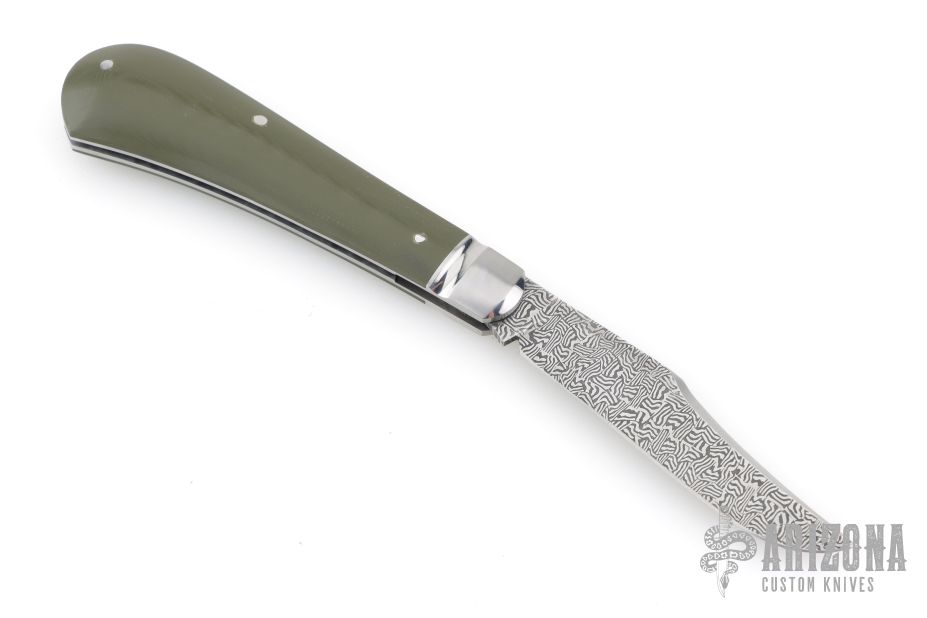 This Single Blade Trapper by Chris Sharp features his Patent Pending see-through escutcheon. Us patent # 11,407,126. This knife has a 1084/15N20 Damascus blade with nail nick. The handle has fluted 416ss bolsters with integral liners and escutcheons, green G-10 covers, filework on liner spines, stainless steel spring. Has half-stop, flush in all positions. Comes with zippered case. New from maker at the 2026 Blade Show Texas.