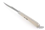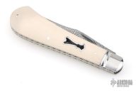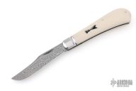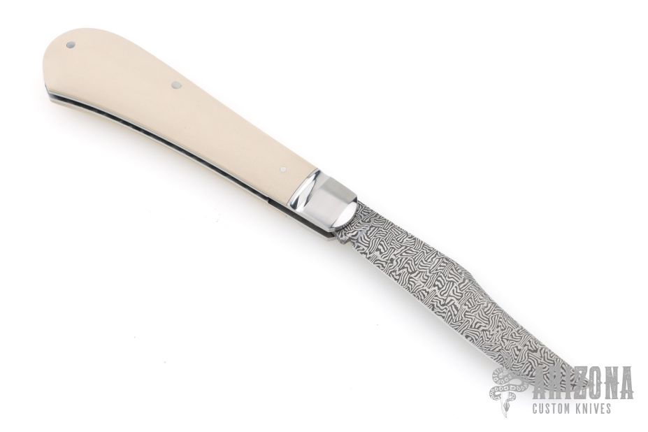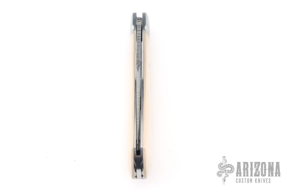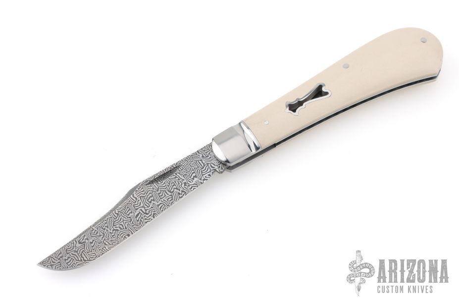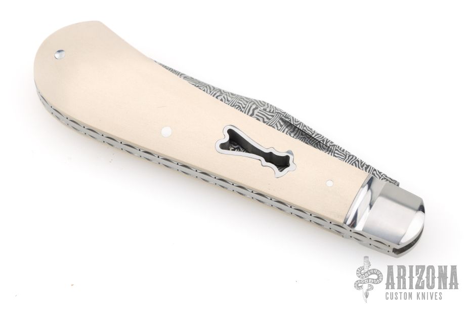 This Single Blade Trapper by Chris Sharp features his Patent Pending see-through escutcheon. Us patent # 11,407,126. This knife has a 1084/15N20 Damascus blade with nail nick. The handle has fluted 416ss bolsters with integral liners and escutcheons, ivory paper micarta covers, filework on liner spines, stainless steel spring. Has half-stop, flush in all positions. Comes with zippered case. New from maker at the 2026 Blade Show Texas.