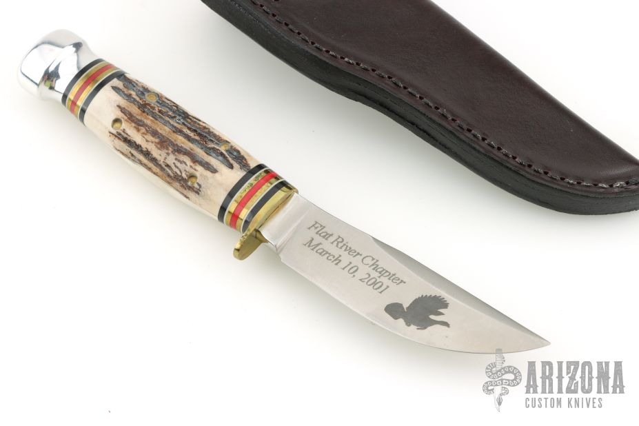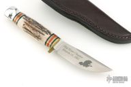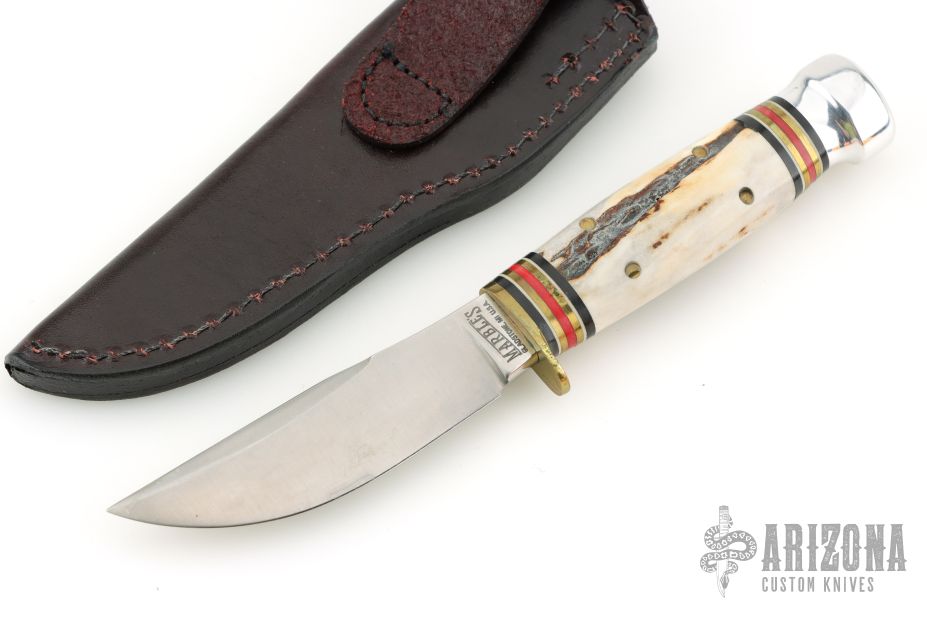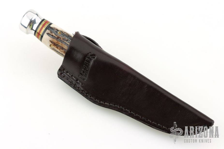 This knife by Marbles features a satin finished blade, .215" blade stock and .965" blade depth, hidden tang construction. The handle has a brass guard with stag covers, red/white/brass/black spacers and aluminum butt cap. Comes with original box, papers, and brown leather sheath. Excellent condition.