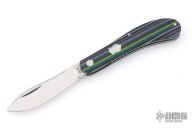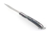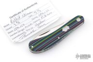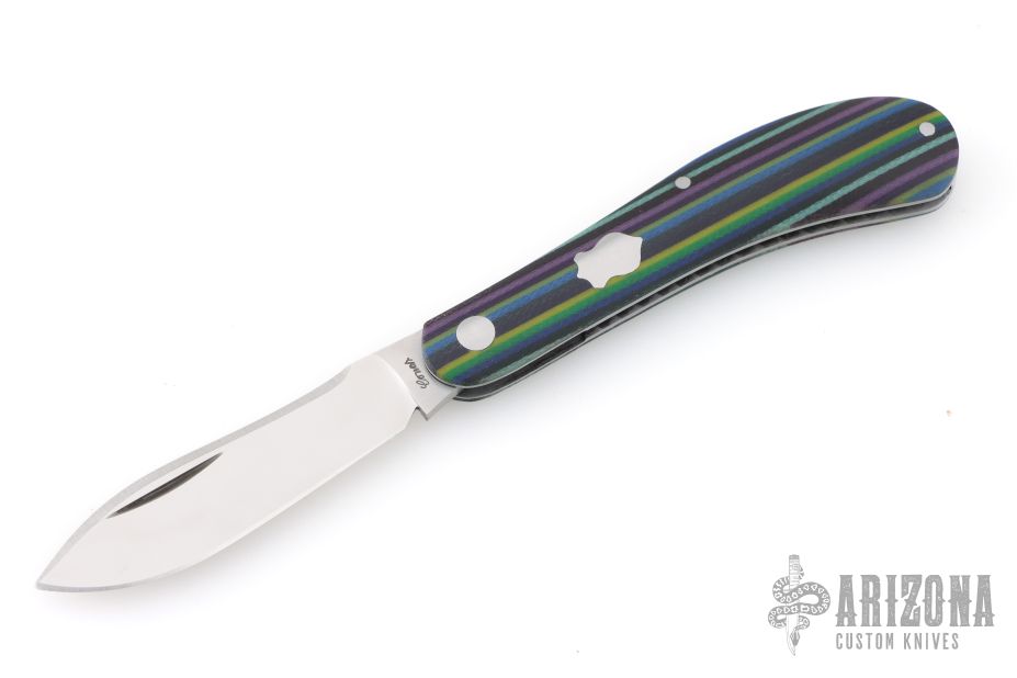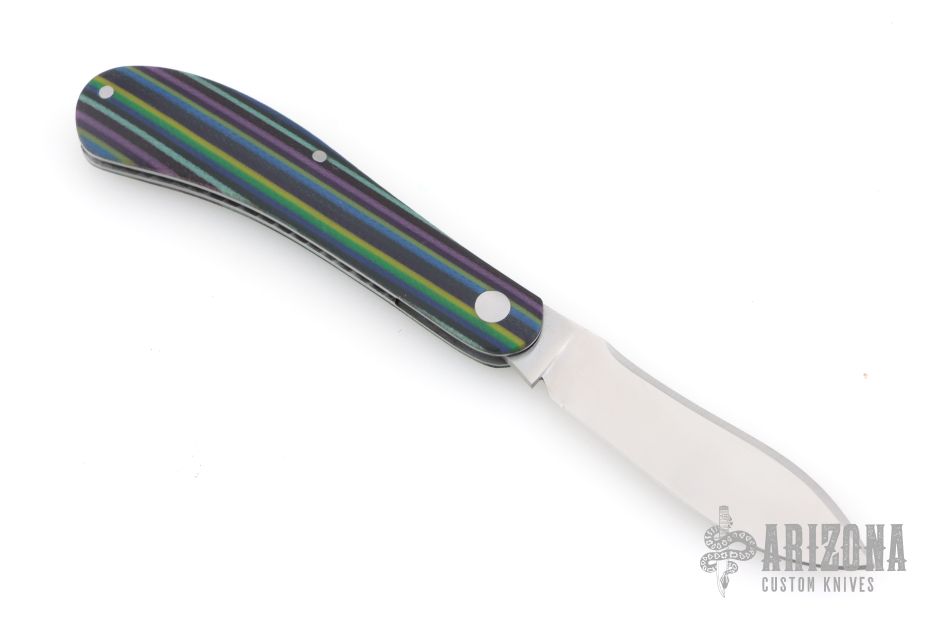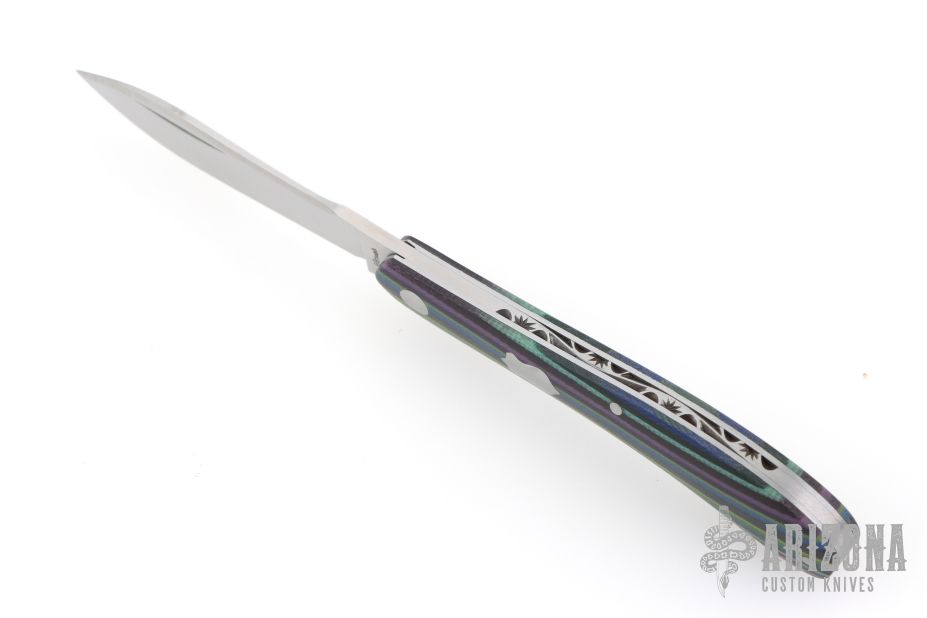 This Shadow Pattern Rabbit Skinner by Couch Knives features a satin finished blade with nail nick. The handle has micarta covers with a steel pivot, pins and escutcheon, steel liners, fileworked CPM154 spring. Has half-stop, flush in all positions. Comes with a zippered case and COA. New from maker at the 2026 Blade Show Texas!
