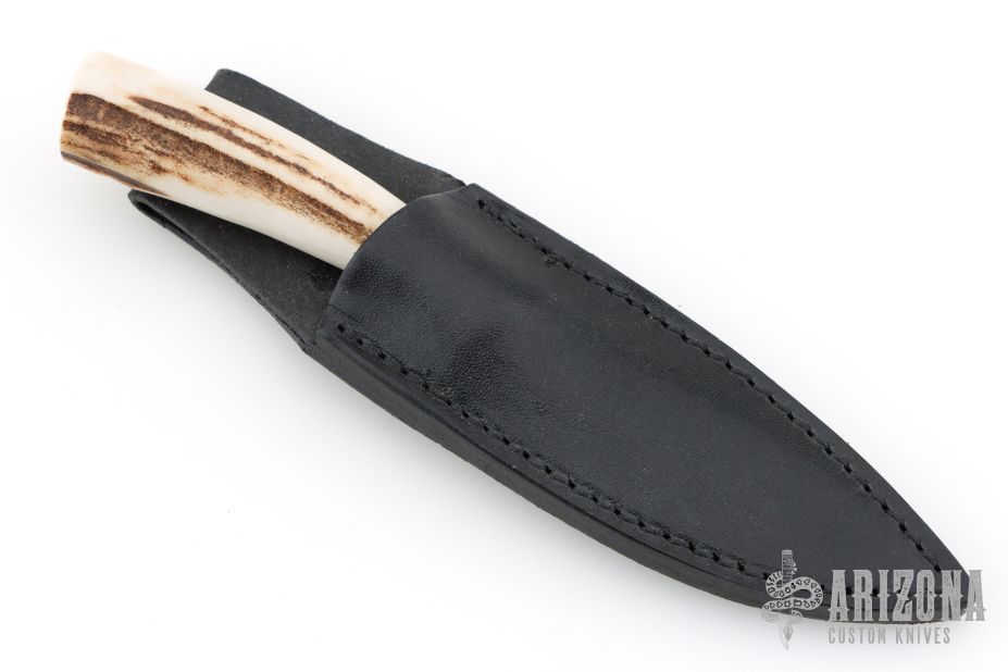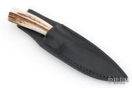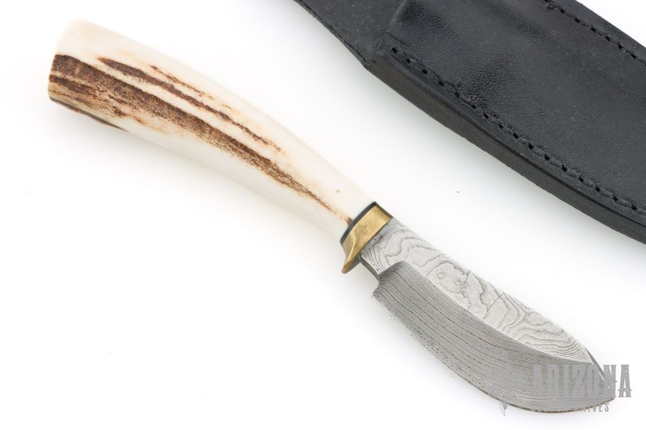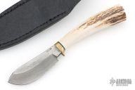 This Skinner by Kelgin features a Damascus blade with .211" blade stock and .87" blade depth, hidden tang construction. The handle has a brass guard, black spacer, and stag grip. Comes with a black leather sheath and COA. Excellent condition.
