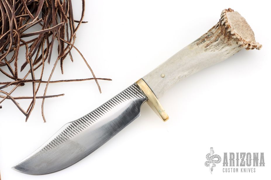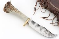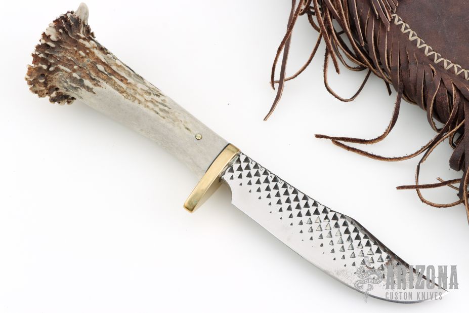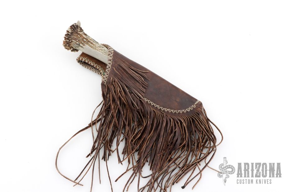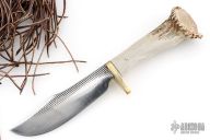 This knife by Lukus Hurt features a mirror polished blade made from a farrier's rasp, .3" blade stock and 1.375" blade depth, hidden tang construction. The handle has a brass guard, black spacer, and single pinned crown stag grip. Comes with leather sheath. Has some scratches, great condition overall.