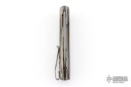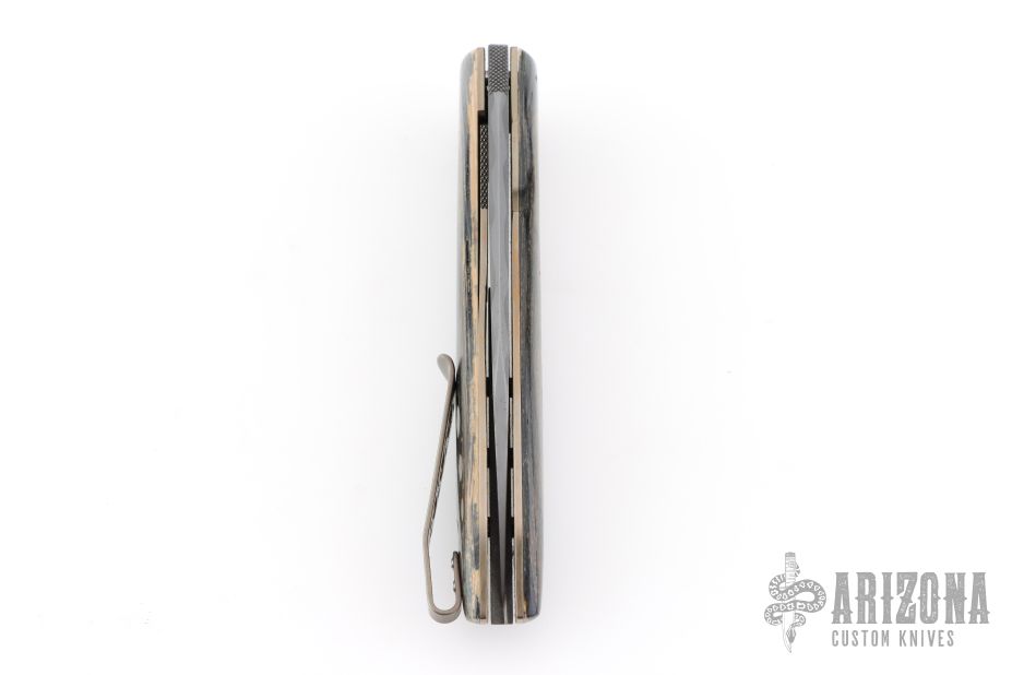 This Flarehawk by Brad Zinker features a Chad Nichols MagnaBoom San Mai Damascus blade with checkered thumbrest and flipper. The handle has beautiful mammoth ivory scales, anodized titanium liners with laser engraved jeweled interiors and a tip up tumbled and anodized titanium clip, floating ArmorCore San Mai Damascus backspacer. Rides on bearings, nice detent, lockup and blade seating. Comes with zippered case. New from maker at the 2026 Blade Show Texas.