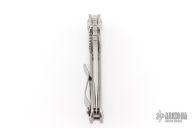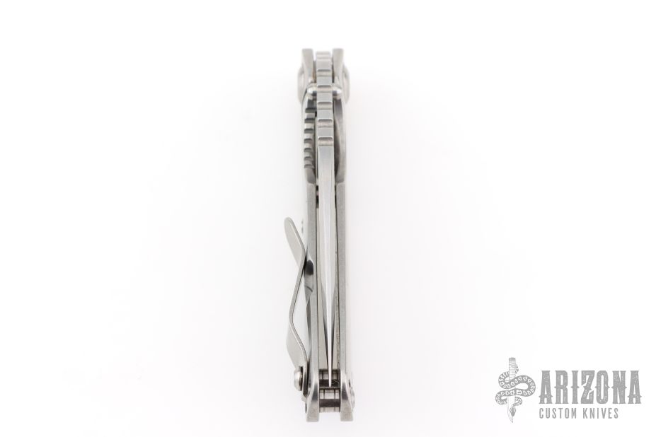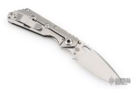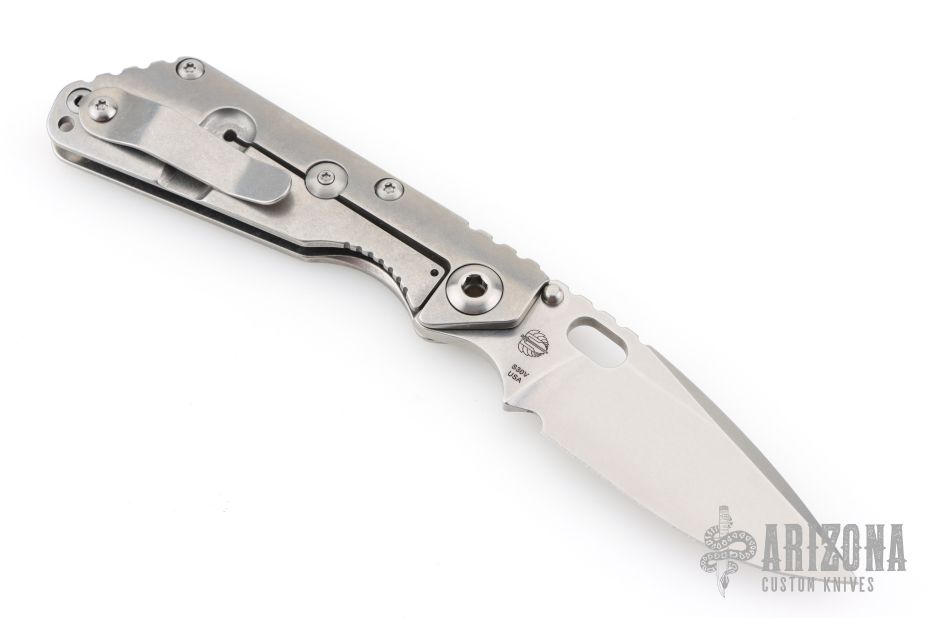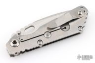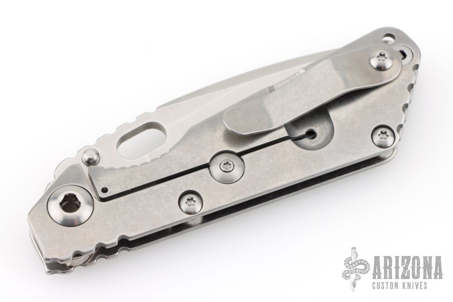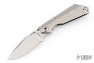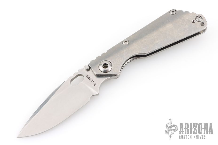 This Mick Strider Performance series SNG framelock folder features a stonewashed drop point blade with thumbhole and notched thumbrest. The handle has a stonewashed titanium frame with titanium clip, tip up carry. Jimping on blade spine. Includes Hinderer "Lock Bar Stabilizer" for maximum reverse lock retention. Nice lockup, detent, and blade seating. New condition.