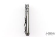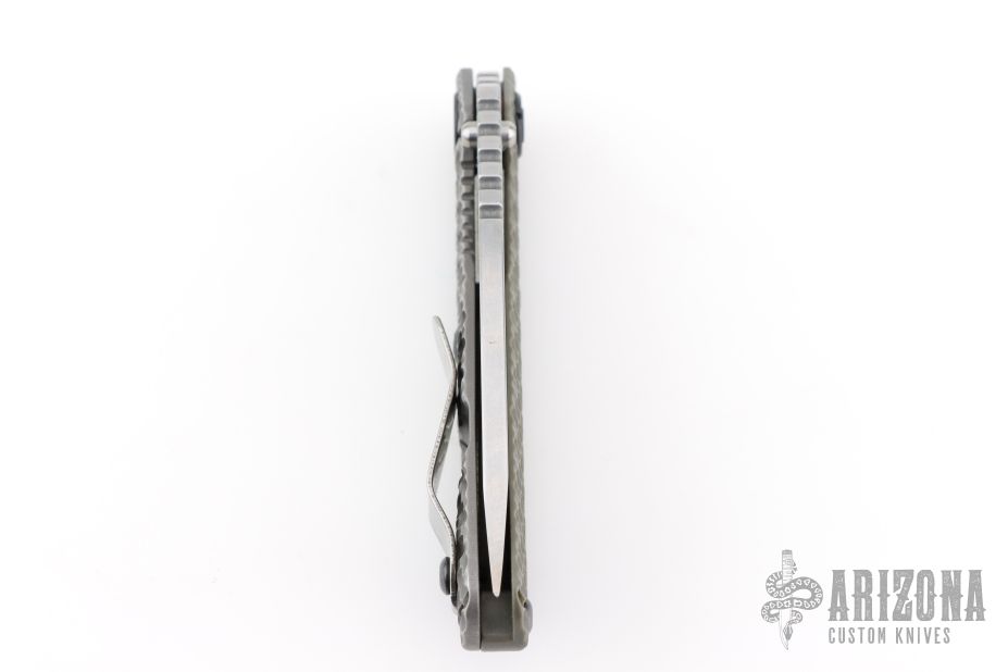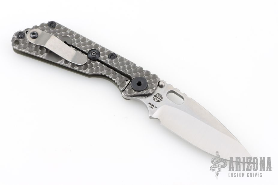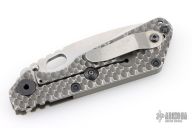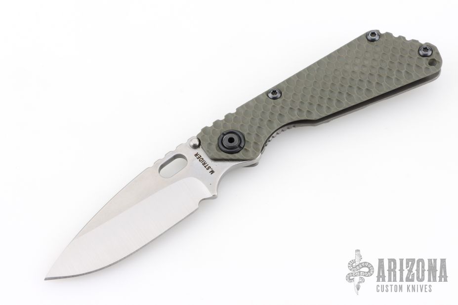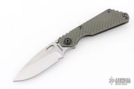 This SNG DGG by M Strider has a stonewash blade with dual thumb studs, thumbhole, and notched thumbrest. Handle is OD Green G-10 and titanium "Gunner Grip", lockbar stabilizer, and titanium tip up clip. Nice detent, lockup and blade seating. Has scratches on the clip, otherwise excellent condition.
