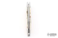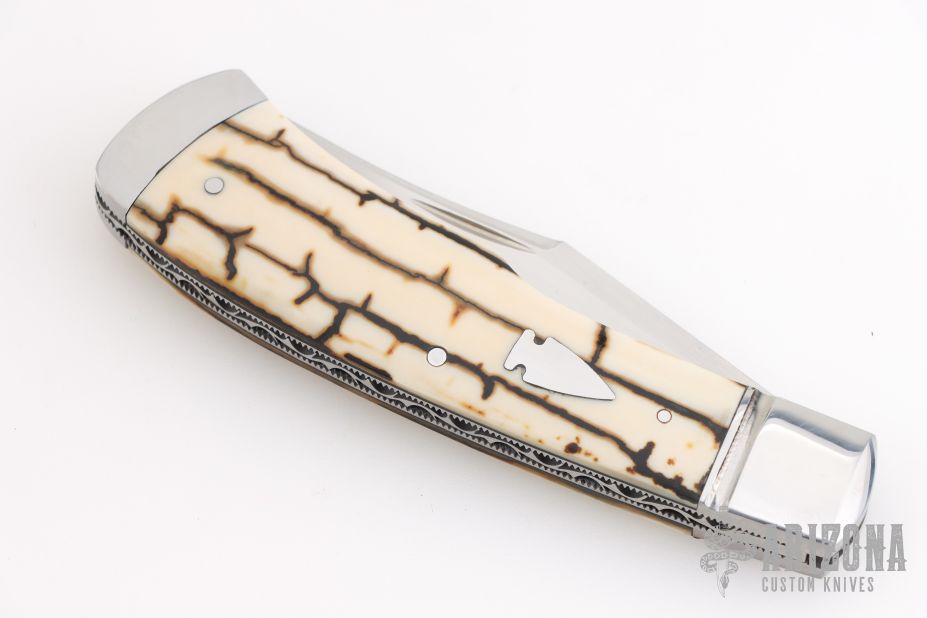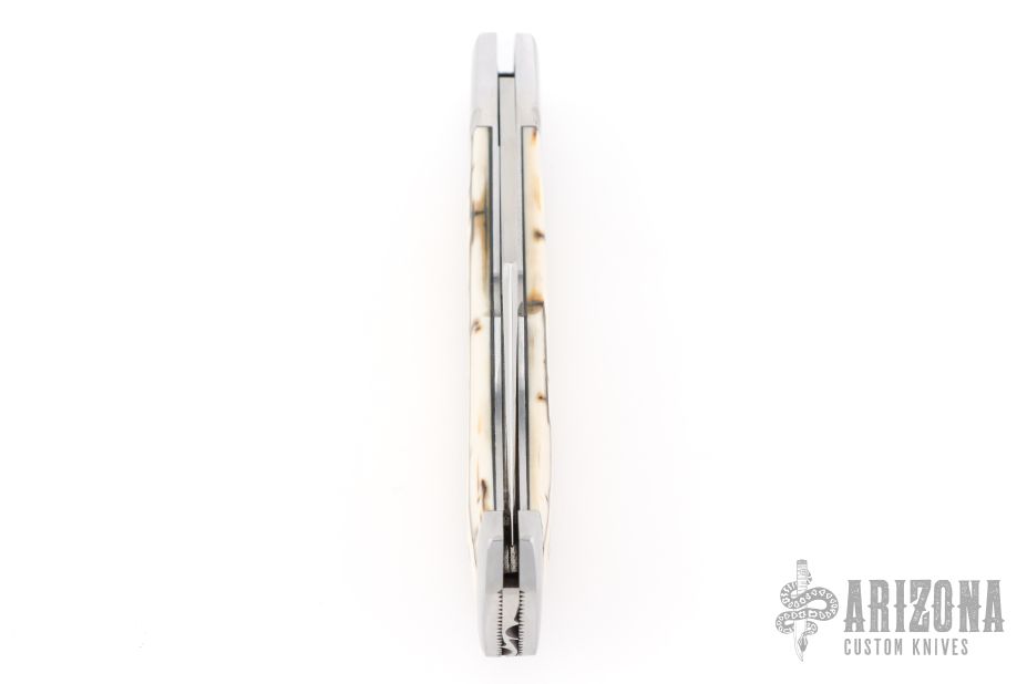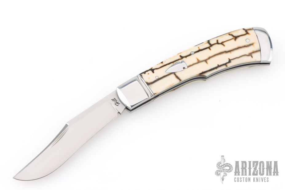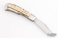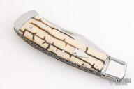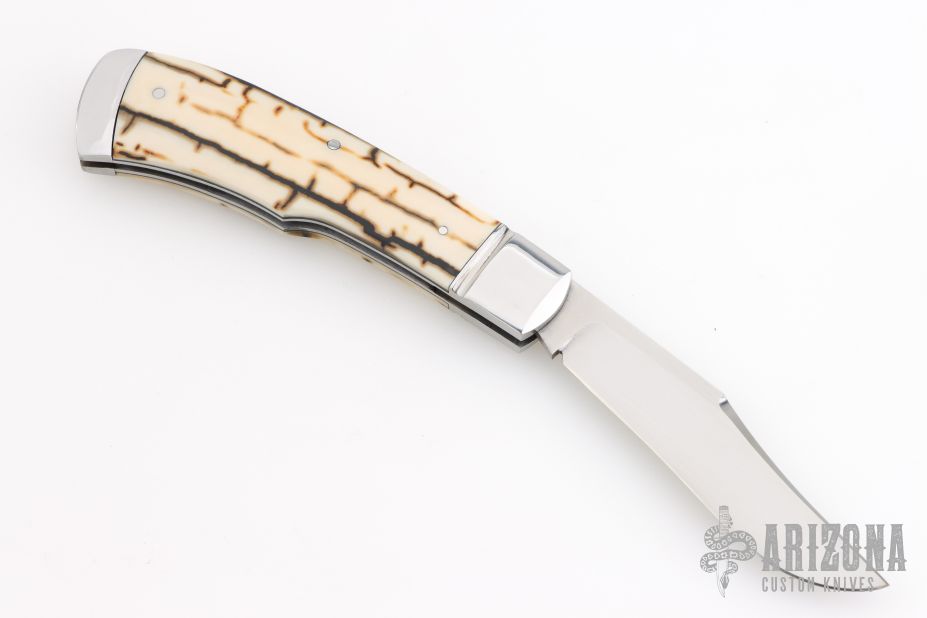 This "Hill Lock" Trapper by Tobin Hill features a hand rub satin finished clip point blade with a nail nick.  The handle features stainless steel bolsters, barb wire mammoth ivory covers with black liners and a stainless steel escutcheon, coin edge stainless steel liners, and a file worked stainless steel backspacer connected to the rear bolsters forming the "Hill Lock". Once open, press down on the rear bolsters to release the lock and close the knife. Includes maker's padded zippered case.  Brand New from maker at the 2026 Blade Show West!