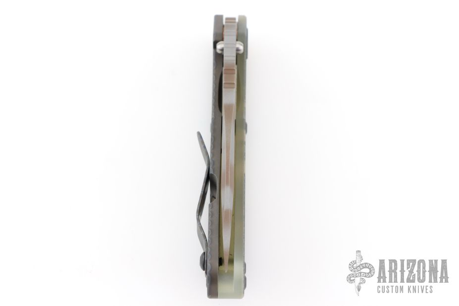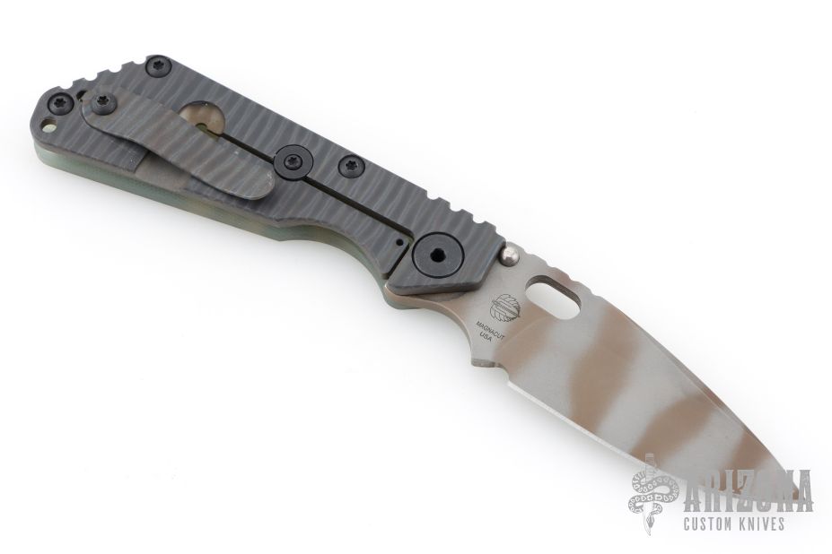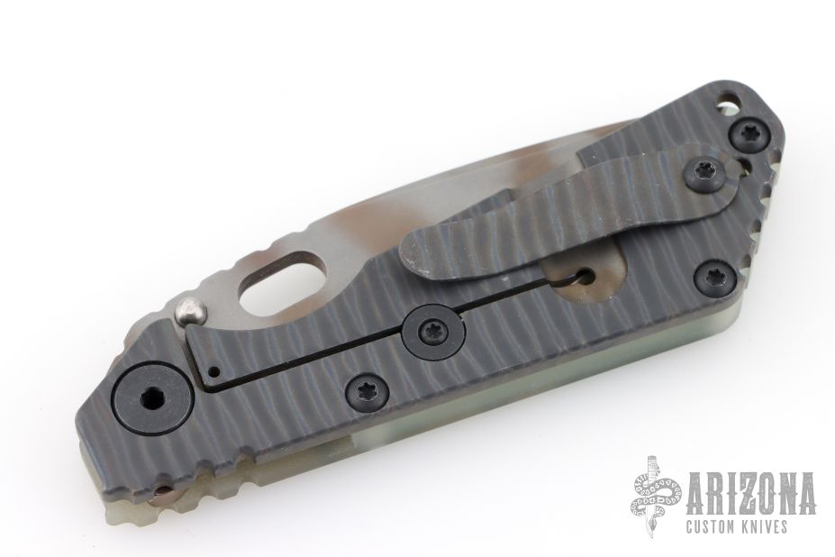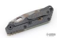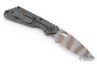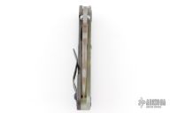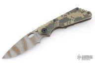 This Mick Strider SNG framelock folder features a ghost stripe blade with thumbhole and notched thumbrest. The handle has an ACS Camo G-10 and flamed titanium frame with titanium clip, tip up carry. Jimping on blade spine. Nice lockup, and blade seating. Has some scuffs, otherwise excellent condition.