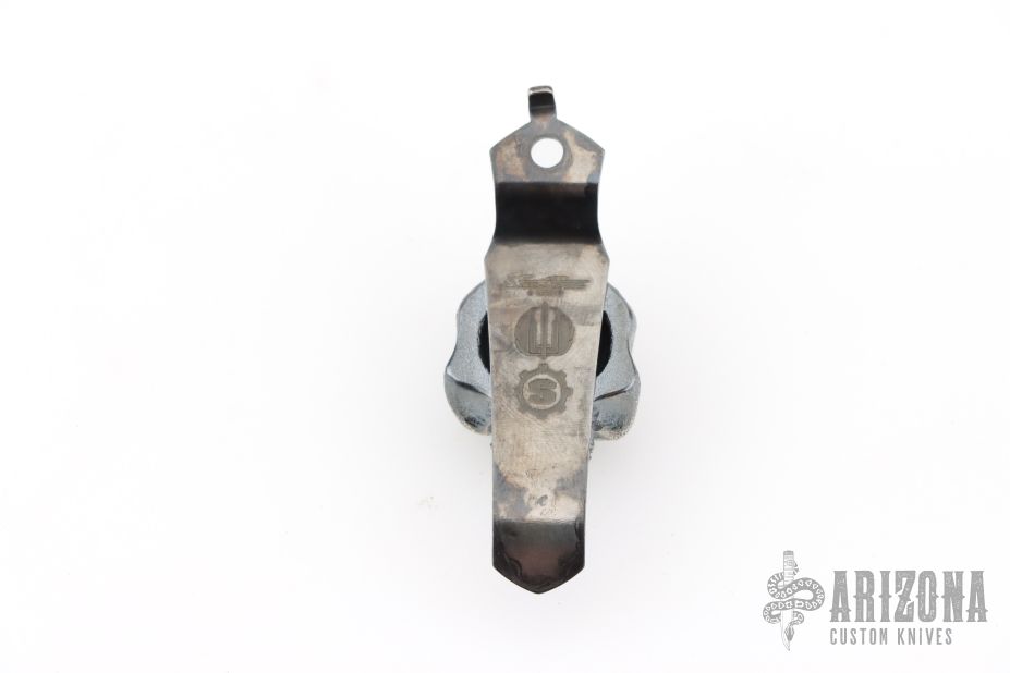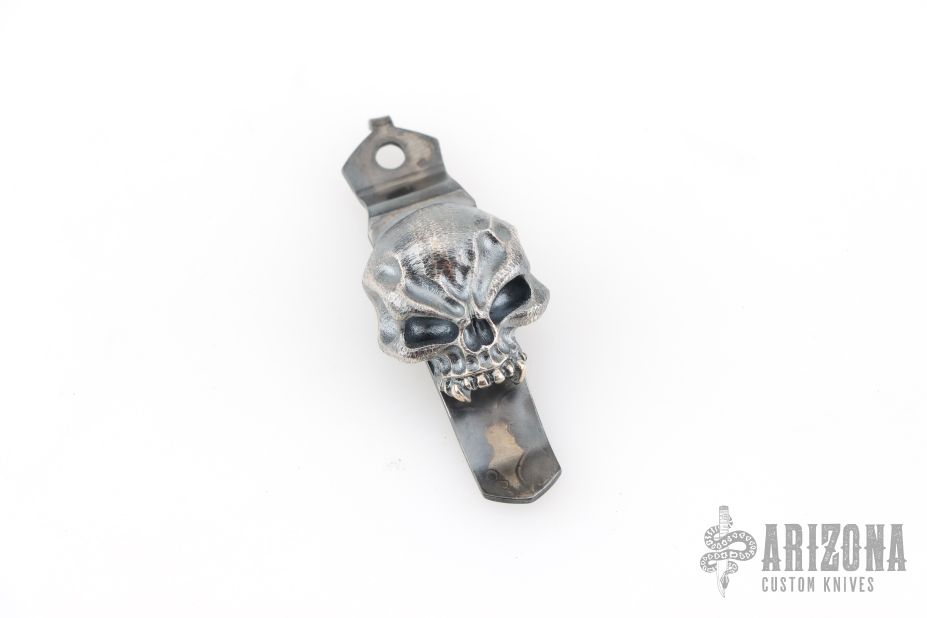 Dress up your Strider knife with this triple collaboration pocket clip from Steel Flame and Starlingear! Flamed pocket clip with a silver Hard Warrior sitting on top featuring a patina'd finish with polished highlights and measuring about 1 inches tall by .895inches wide. Excellent condition. All three maker's logos are on the rear of the clip.