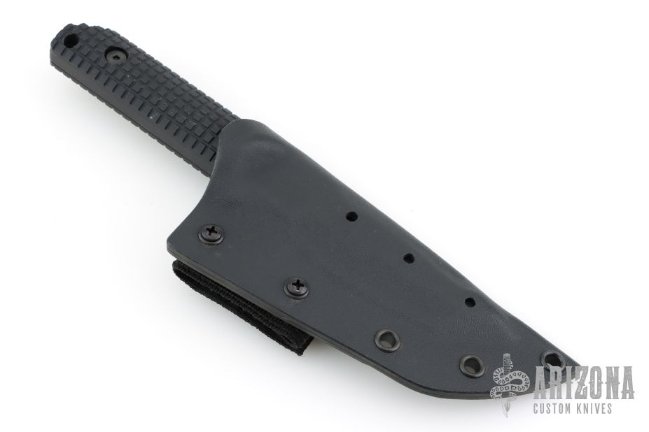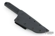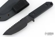 This DUB-L by Strider Knives features a black tanto blade with serrated top edge and notched thumbrest, .256" blade stock and 1.353" blade depth, full tang construction. The handle has Monkey Edge frag pattern black G-10 scales. Comes with kydex sheath. Has a few light scuffs, otherwise excellent condition.
