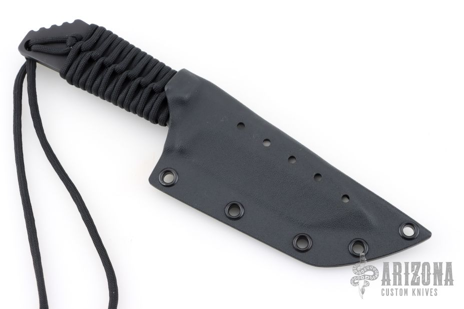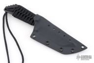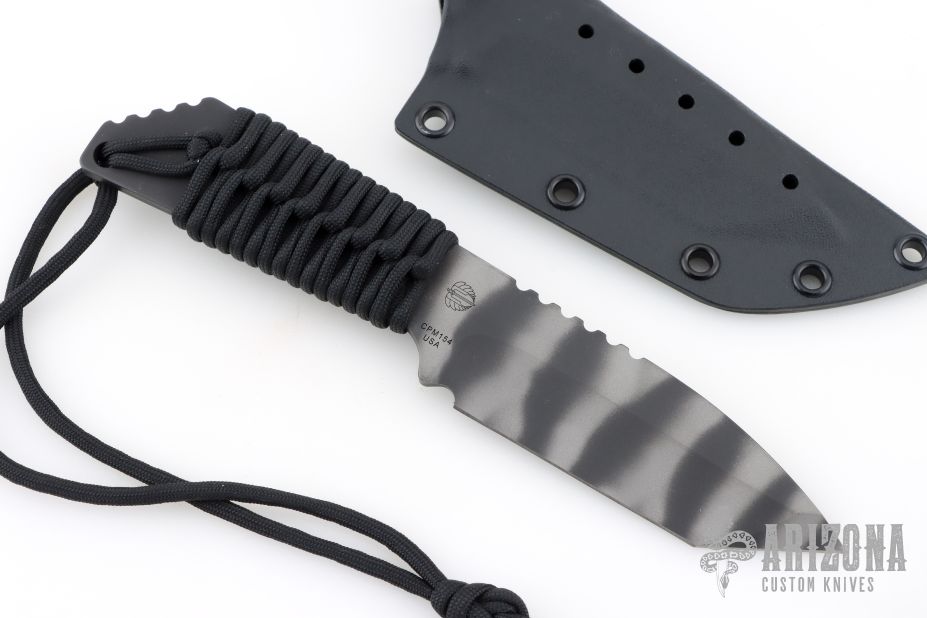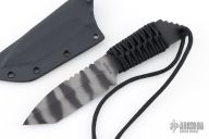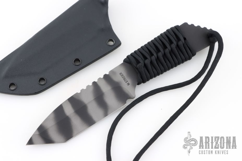 This knife by Mick Strider features a tiger striped tanto blade with a notched thumbrest, .207" blade stock and 1.380" blade depth, full tang construction. The handle has a cord-wrapped grip. Comes with a kydex sheath. Excellent condition.