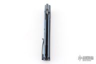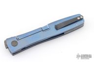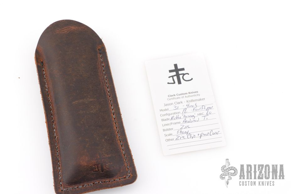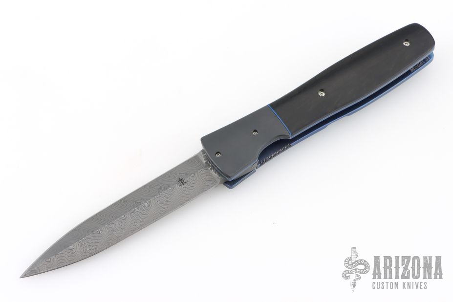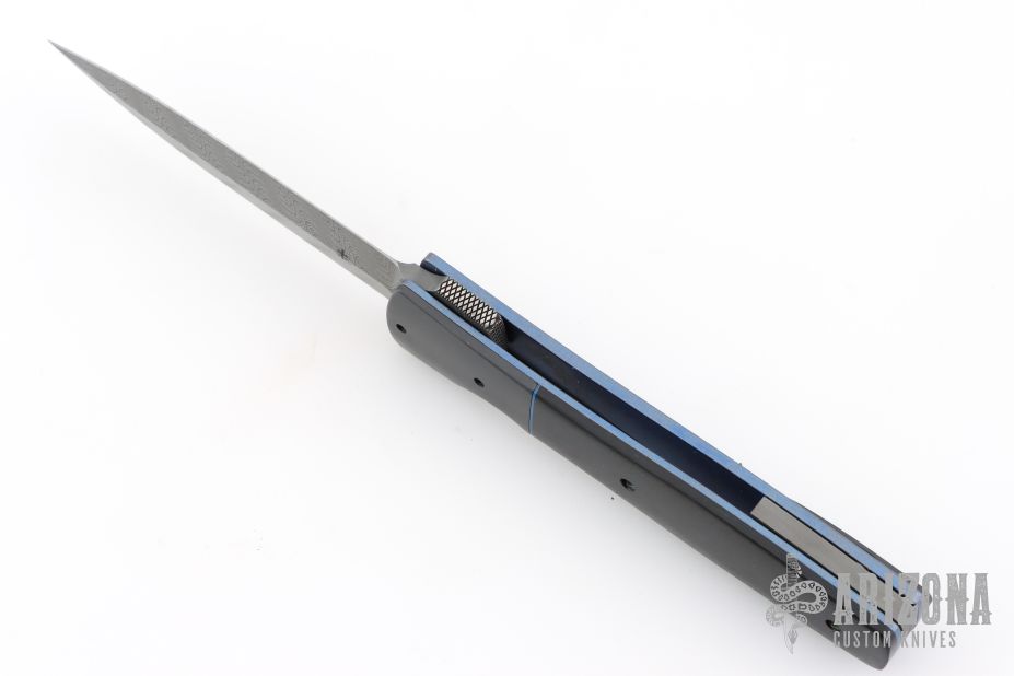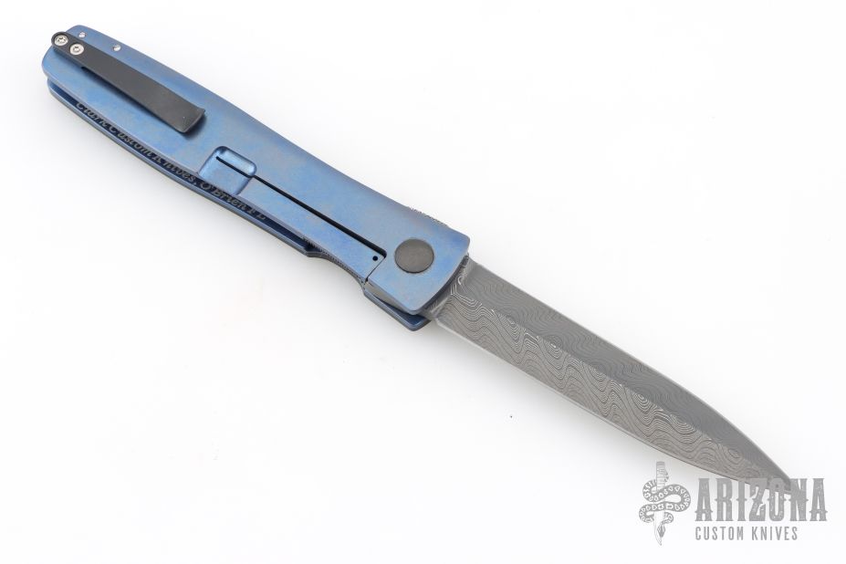 This Model 31 Framelock Front Flipper by Jason Clark features a double edged Chad Nichols Boomerang Damascus blade with a notched flipper. The handle has a dovetailed zirconium bolsters, ebony scale with blue spacer, tumbled and anodized titanium frame, floating Damascus backspacer, tip up zirconium clip, zirconium pivot cover. Rides on IKBS, nice detent, lockup and blade seating. Comes with a leather slip sheath and COA. New from maker at the 2026 Blade Show Texas.