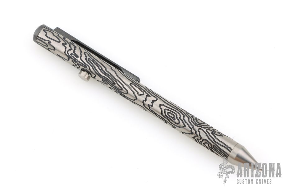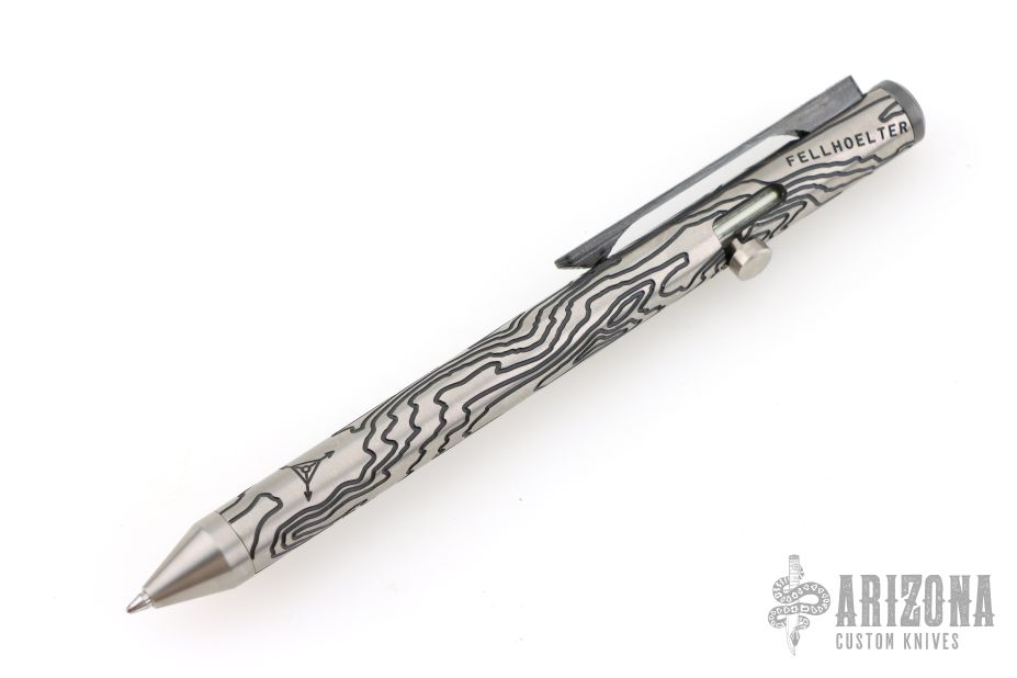 Made completely of Titanium with the only exceptions being the ink cartridge, and the spring. Pen is new from Mr. Fellhoelter and comes in original plastic storage tube. There are trit vials in the bolt, has a two tone tuxedo finish, and a black Damasteel clip.