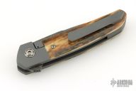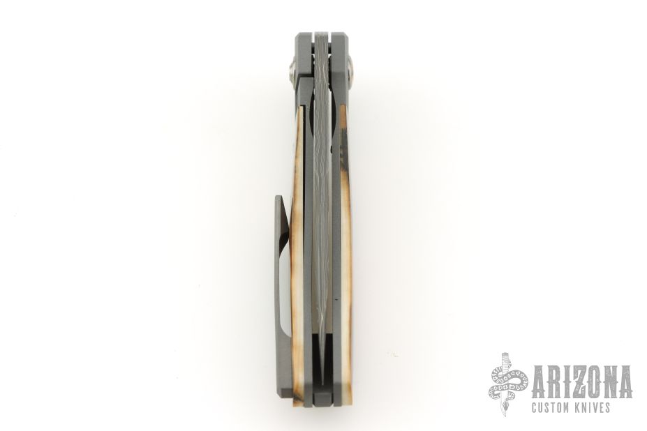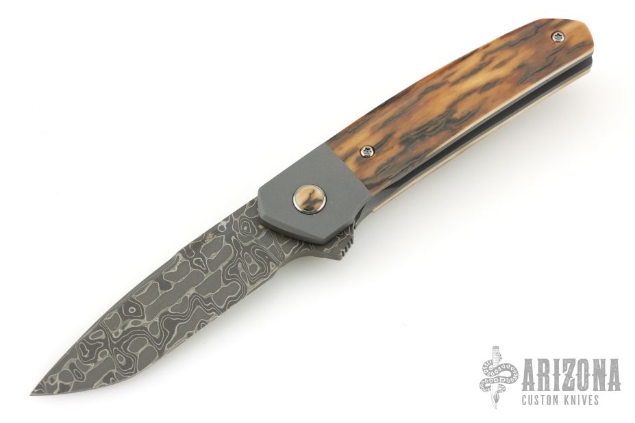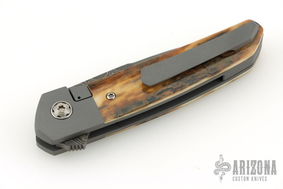 The handle showcases bead-blasted titanium bolsters and frame, along with a matching backspacer and tip-up pocket clip. Beautiful mammoth ivory inlays and scales add a unique, premium touch to this piece.