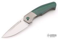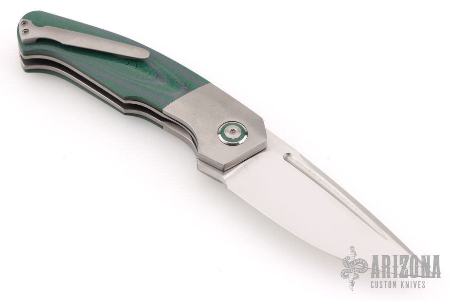 The handle is beautifully finished with orange peel bolsters, paired with green emerald vintage 3-layer micarta scales. It also features tumbled and anodized titanium liners, an anodized backspacer with lanyard pin, and a tip-up bead-blasted and anodized titanium pocket clip.