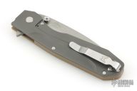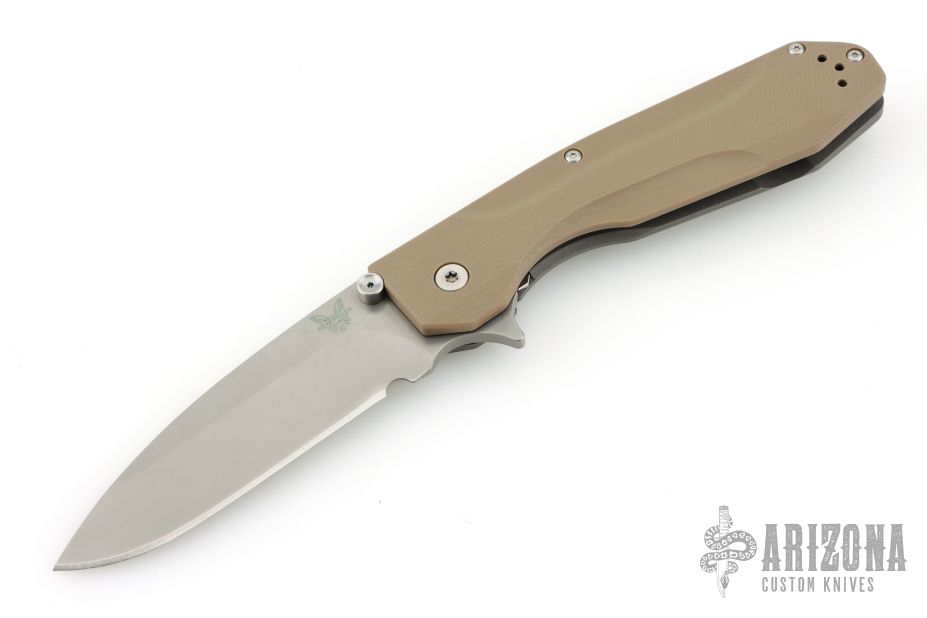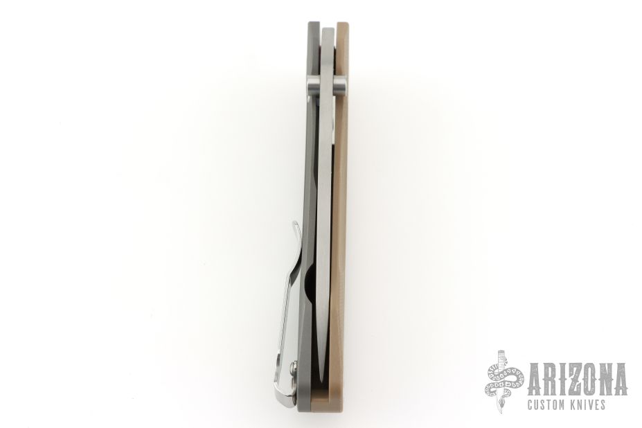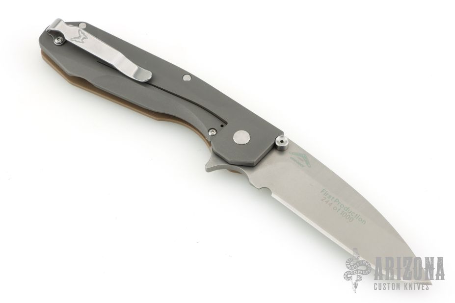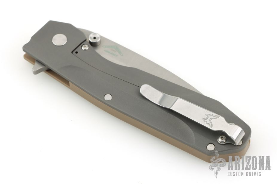 This 928 Proxy by Benchmade features a drop point bead blasted blade with dual thumb studs and flipper. The handle is comprised of a machined tan G10 "A" side with a bead blasted titanium lockside. Stainless steel tip up clip is reversible for left/right hand carry. Blade favors the right side slightly, solid lock up. VERY crisp detent. Includes original box, papers, and drawstring pouch. Excellent condition.
