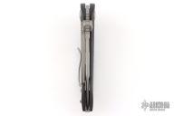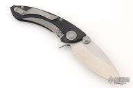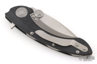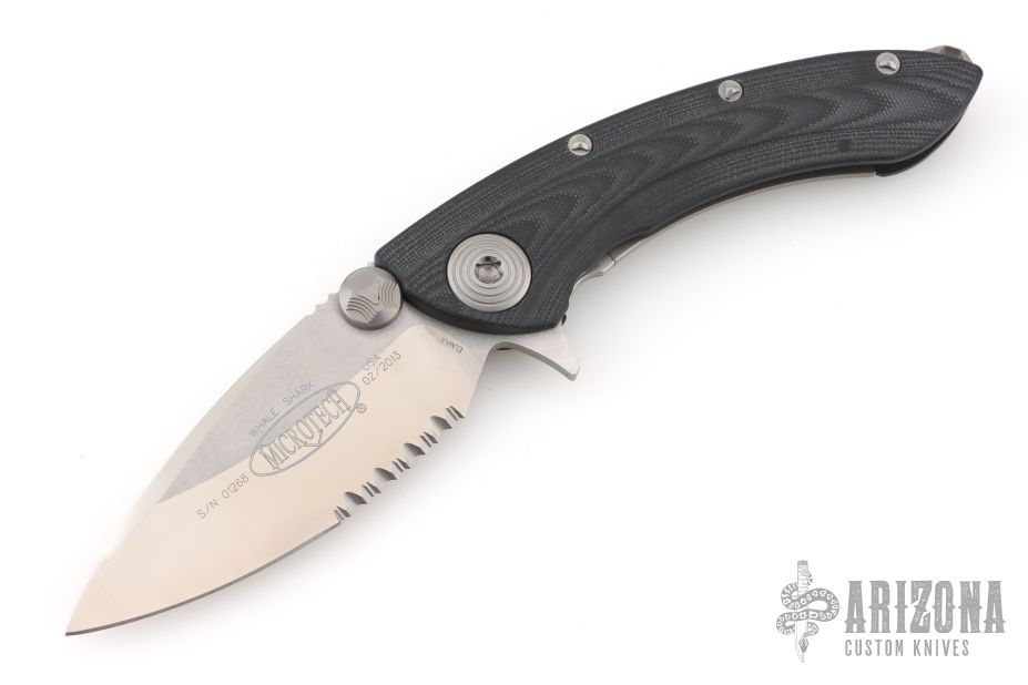 This Whaleshark flipper by Microtech features a satin finished partially serrated blade with flipper and dual thumbstuds. The handle has a black G-10 frame with bead blasted titanium backspacer and tip up clip. Smooth and fast flipper that requires no wrist action. Nice detent and blade seating. Dated 02/2013 and #01268. Comes with original box, papers, and a drawstring pouch. Has a couple light scuffs, otherwise Excellent Condition.