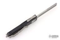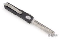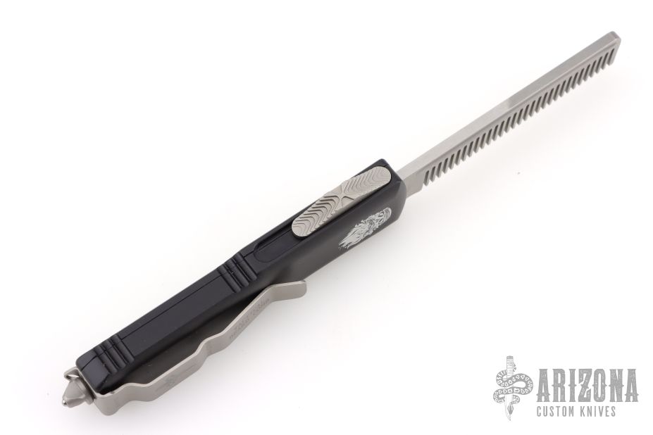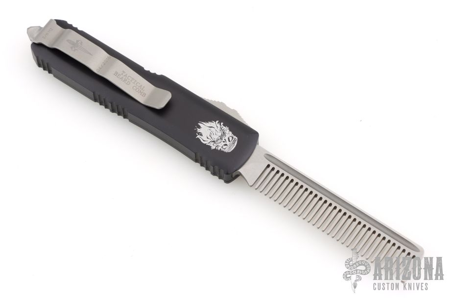 This UTX-85 OTF automatic Tactical Beard Comb by Marfione Custom Knives features a fine tooth hand ground stonewashed comb blade, and a black aluminum handle with tip down bead blasted stainless steel clip. Serial number 112 and dated 04/2016. Comes with original box, zippered case and COA. Excellent condition.
