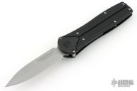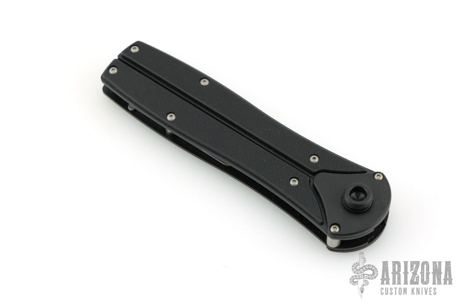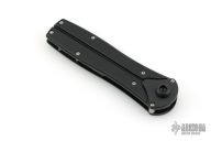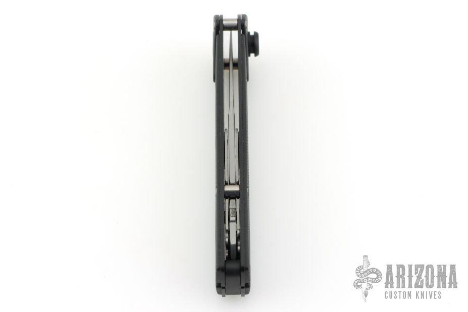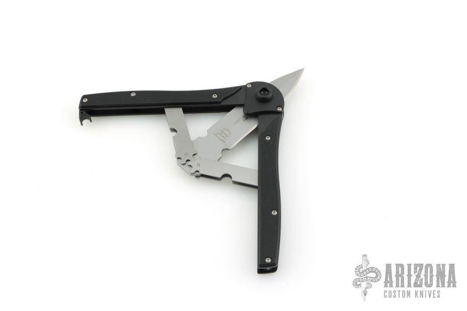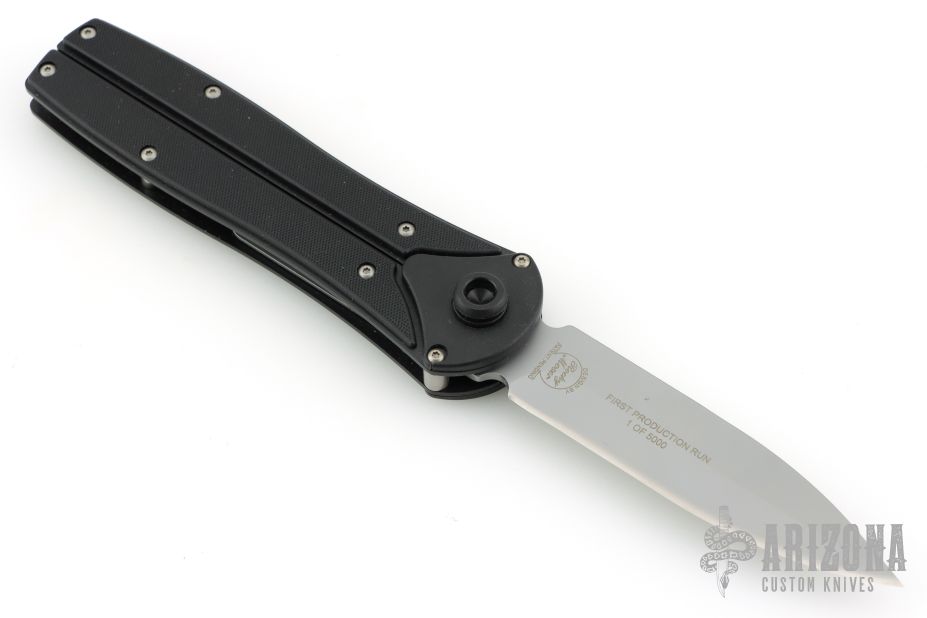 This knife has a bead blast finished blade with false top edge, steel internal components, aluminum liners, and textured plastic covers. Comes with original box and papers. Excellent condition.